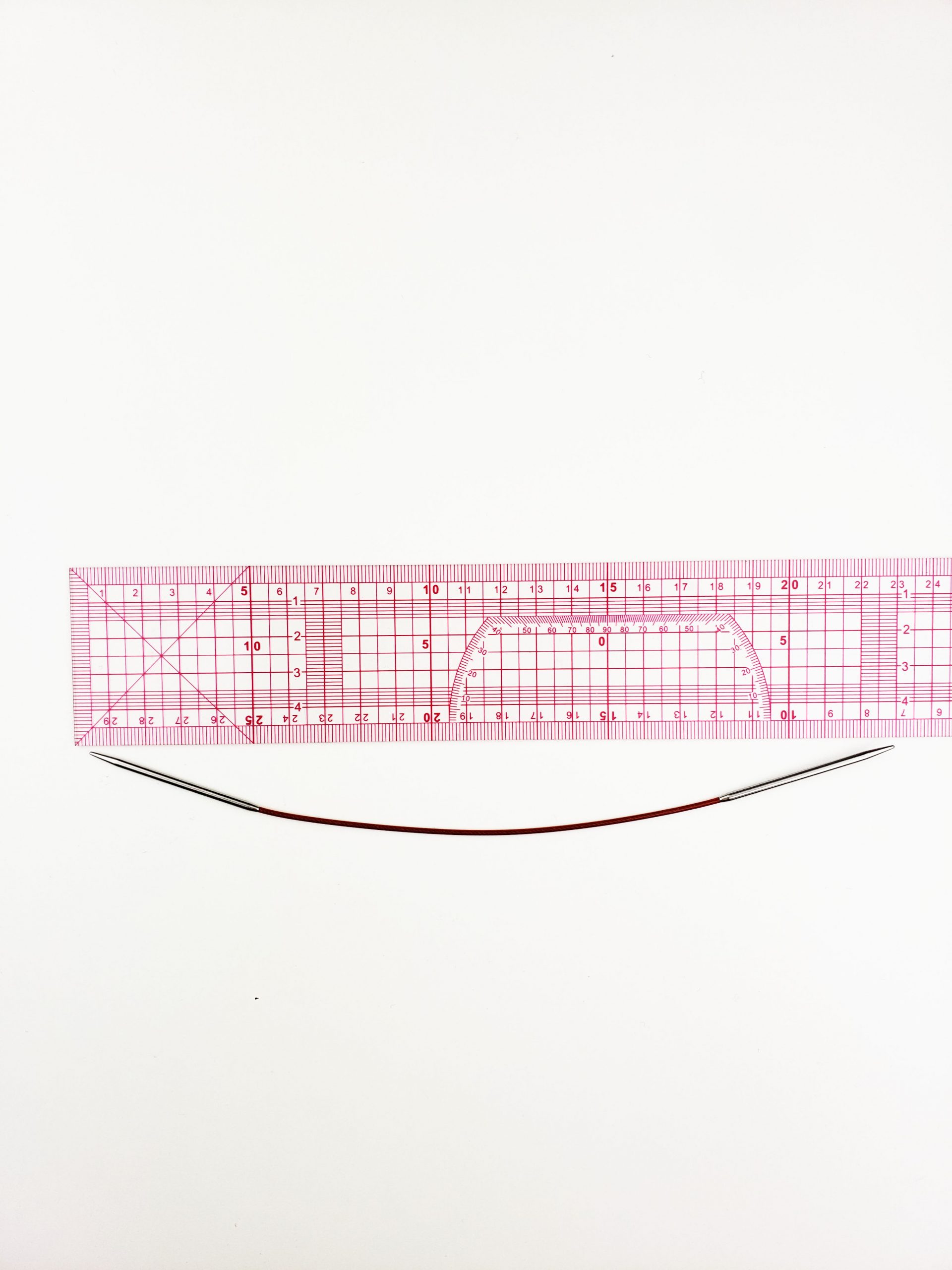 Aiguilles circulaires de la marque Chiaogoo. Pointes métalliques courtes et câble court : 23 cm de l’extrémité d’une pointe à l’autre.