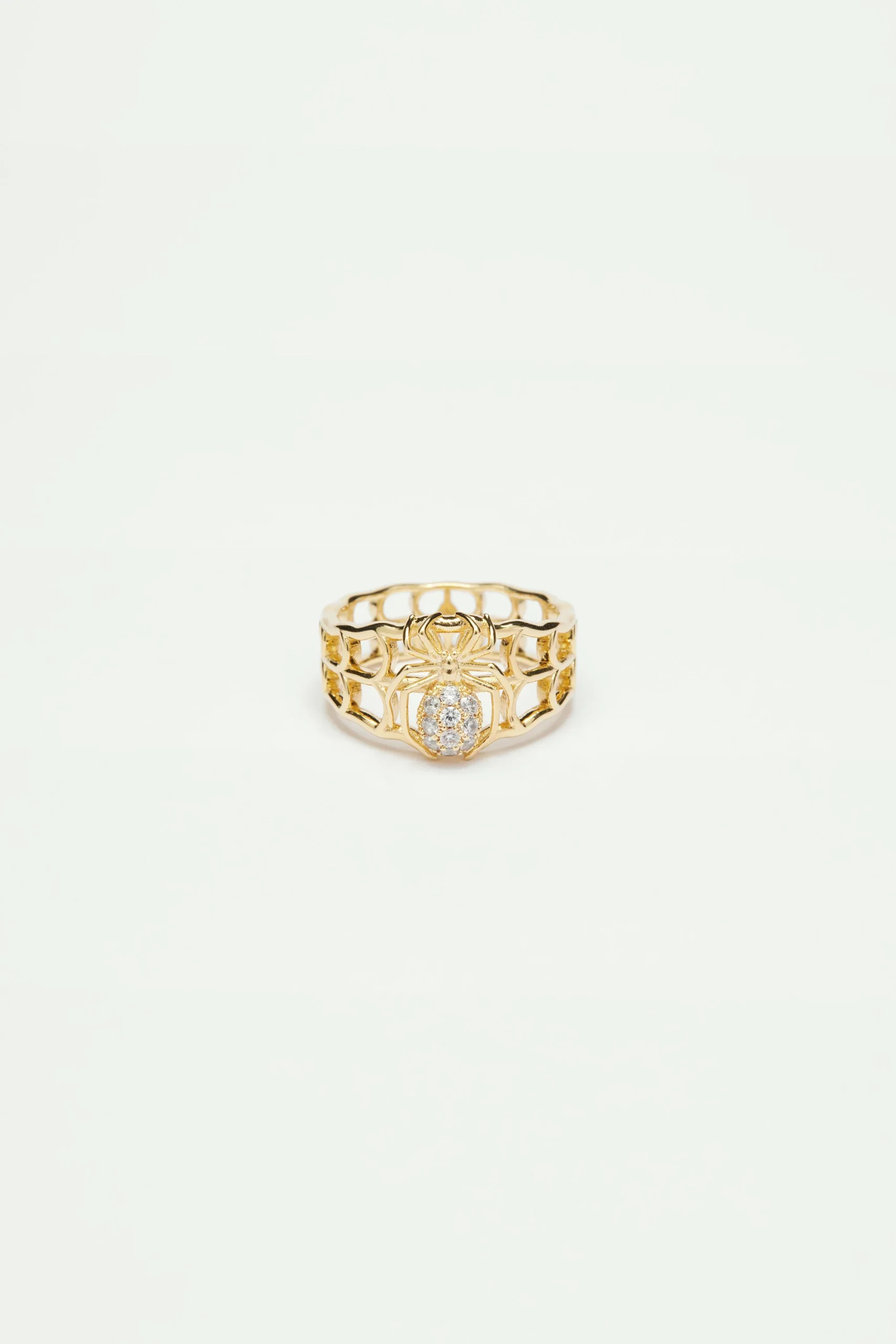 Bague large en laiton ajouré, araignée placée au milieu du bijou ornée de cristaux, doré à l’or fin.