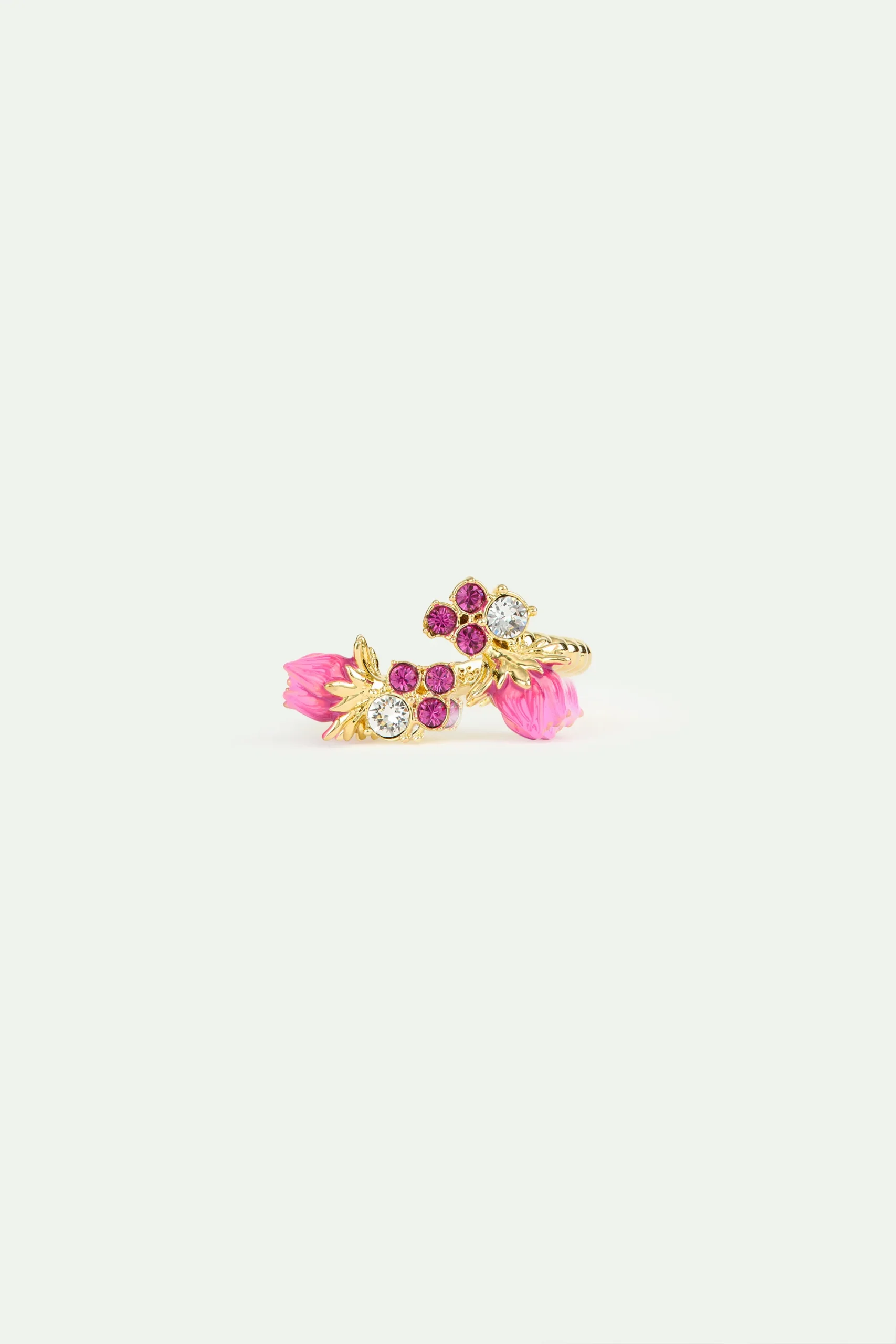 Bague perlée ajustable en laiton doré à l’or fin, boutons de rose peints à la main, ornés de cristaux facettés roses et blancs.