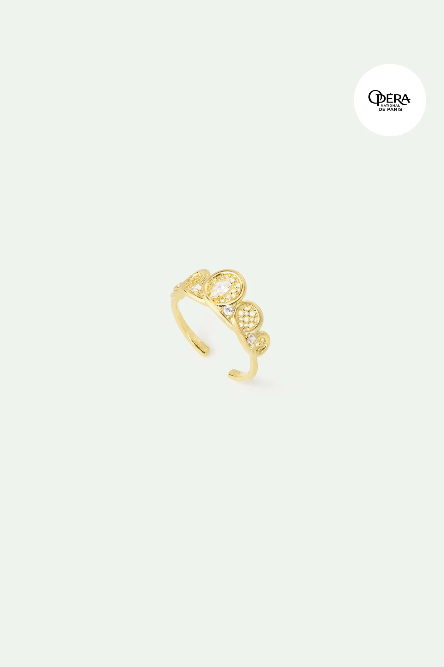 Bague ajustable diadème en laiton doré à l’or fin, ornée de cristaux facettés.