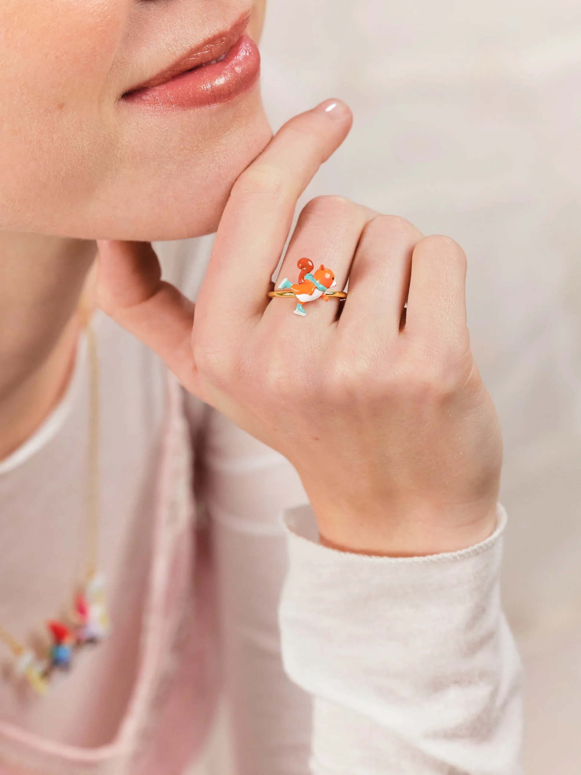 Avec le retour de l’hiver, la charmante famille des Champimignon fait de nouveau son apparition, cette fois avec un invité surprise, son compagnon malicieux l’écureuil. Sur cette bague ajustable, l’écureuil s’offre une escapade hivernale inédite, enfilant ses patins à glace pour glisser avec grâce sur un lac cristallisé au cœur de la forêt enneigée. Ce bijou de créateur capture toute la féerie de la saison hivernale. Il est une invitation à s’immerger dans un conte de fées de glace et de neige, où la nature prend vie avec fantaisie. Combinez cette bague avec les boucles d’oreilles écureuils et patins à glace pour un look riche en couleurs. Bague Ajustable : Laiton doré à l’or fin, peinte à la main.