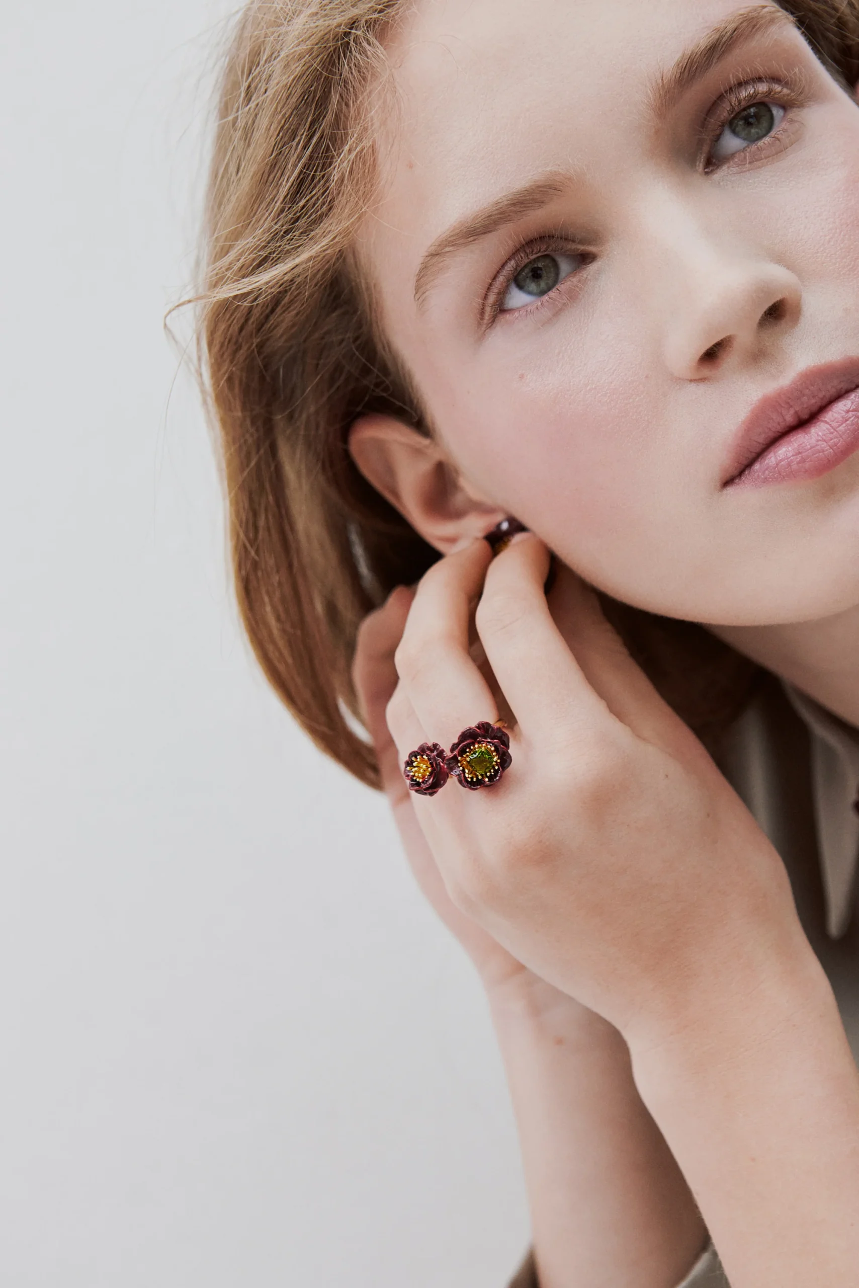 Bague ajustable deux fleurs d’anémone bordeaux foncé peintes à la main, ornées d’une pierre en verre facetté vert taille coussin.