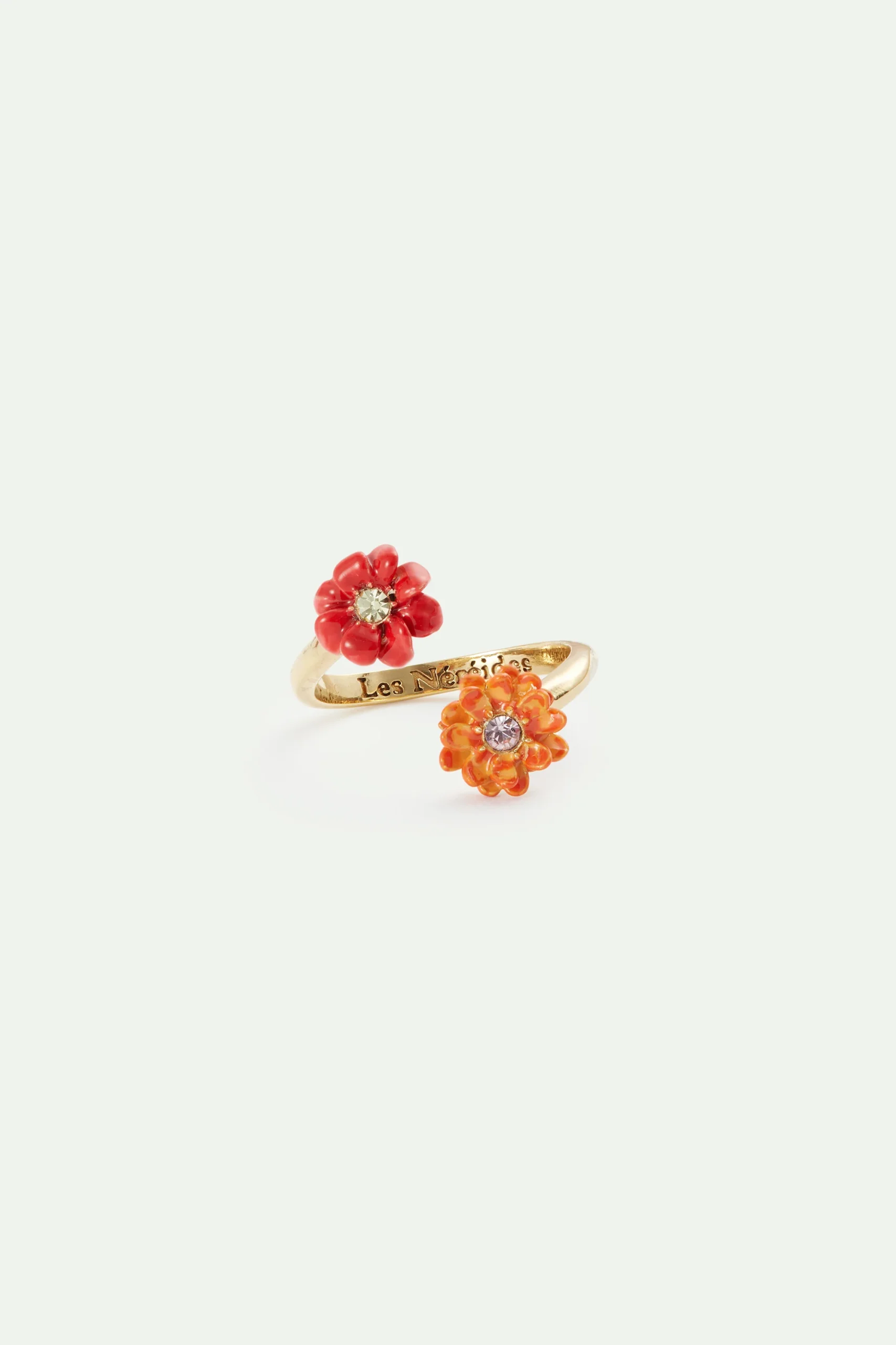 Bague ajustable en laiton doré à l’or fin, fleurs de zinnias rouge et orange peintes à la main et ornées de cristaux. La collection Fleur de Roche invite à une promenade en montagne à la belle saison. Les fleurs naïves et simples poussent parmi les roches. Des détails techniques empruntés à l’escalade se mêlent aux bijoux.