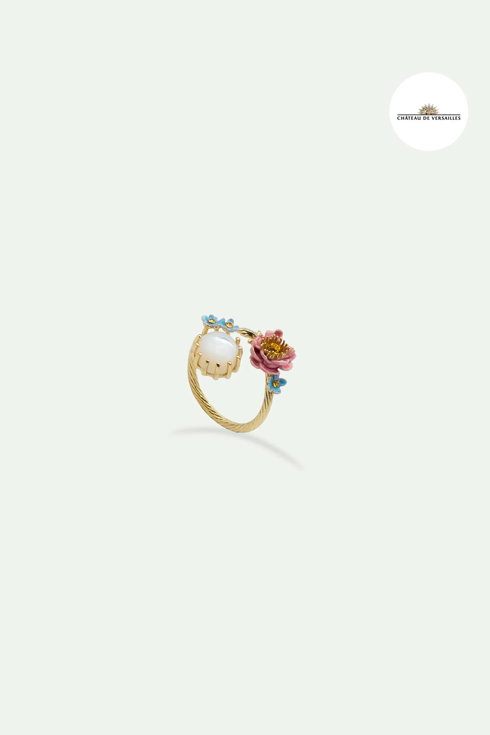Bague ajustable, rose et myosotis peintes à la main et ornées d’un cristal facetté, pierre ronde blanche nacrée, feuille d’acanthe en laiton doré à l’or fin. Les Néréides collabore avec le château de Versailles pour concevoir des parures inspirées de la symbolique de Louis XIV, d’éléments d’architecture, ou encore des jardins luxuriants du château.