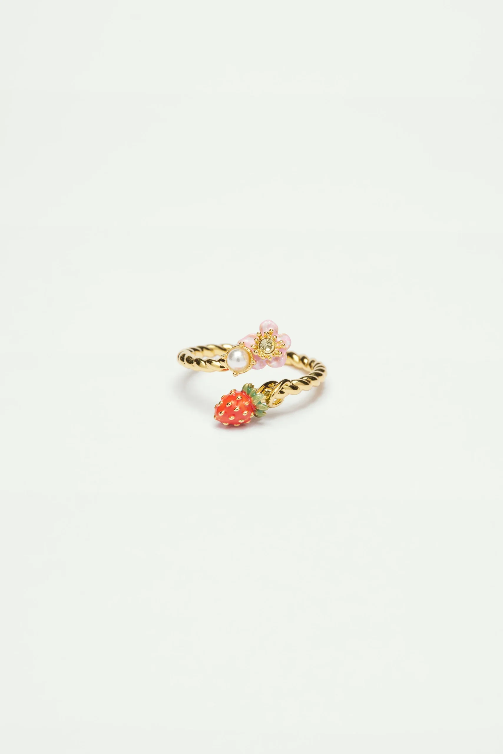 Cette bague ajustable crée un mariage féérique entre deux mondes. D’un côté, une fleur rose de fraisier s’épanouit avec la grâce d’une aube printanière. De l’autre côté, une fraise des bois prend place comme une promesse de saveurs douces et de jours ensoleillés. Sa présence évoque le souvenir sucré des moments passés, une invitation à se laisser emporter par la délicieuse nostalgie des saisons révolues. Cette bague, tel un poème visuel, tisse une toile de poésie avec ses éléments naturels. Elle s’accordera parfaitement avec les boucles d’oreilles fraise des bois et fleur de rose, issues de la même collection.