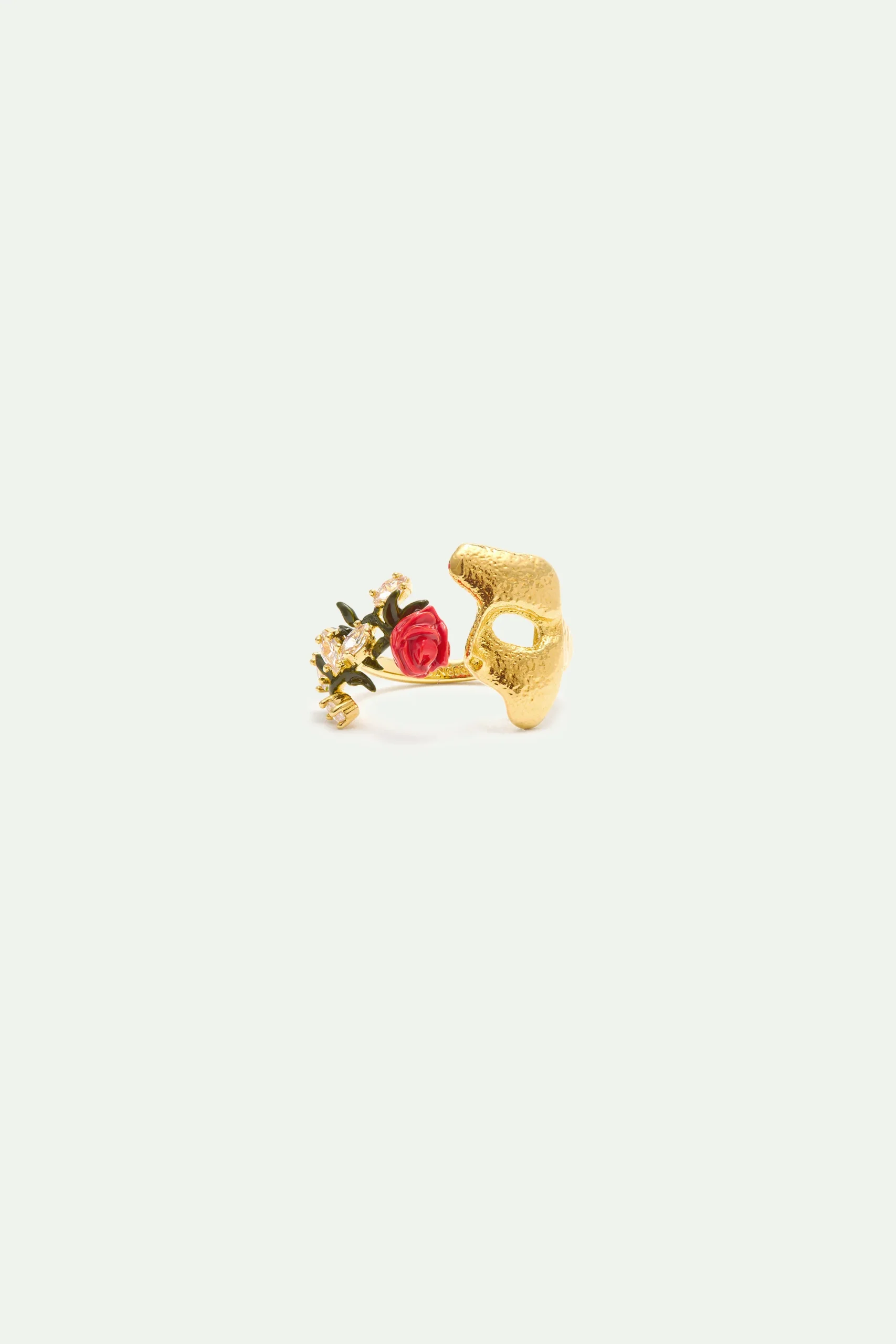 Bague ajustable masque du Fantôme de l’Opéra en laiton texturé et doré à l’or fin, rose rouge peinte à la main ornée d’oxydes de zirconium.
