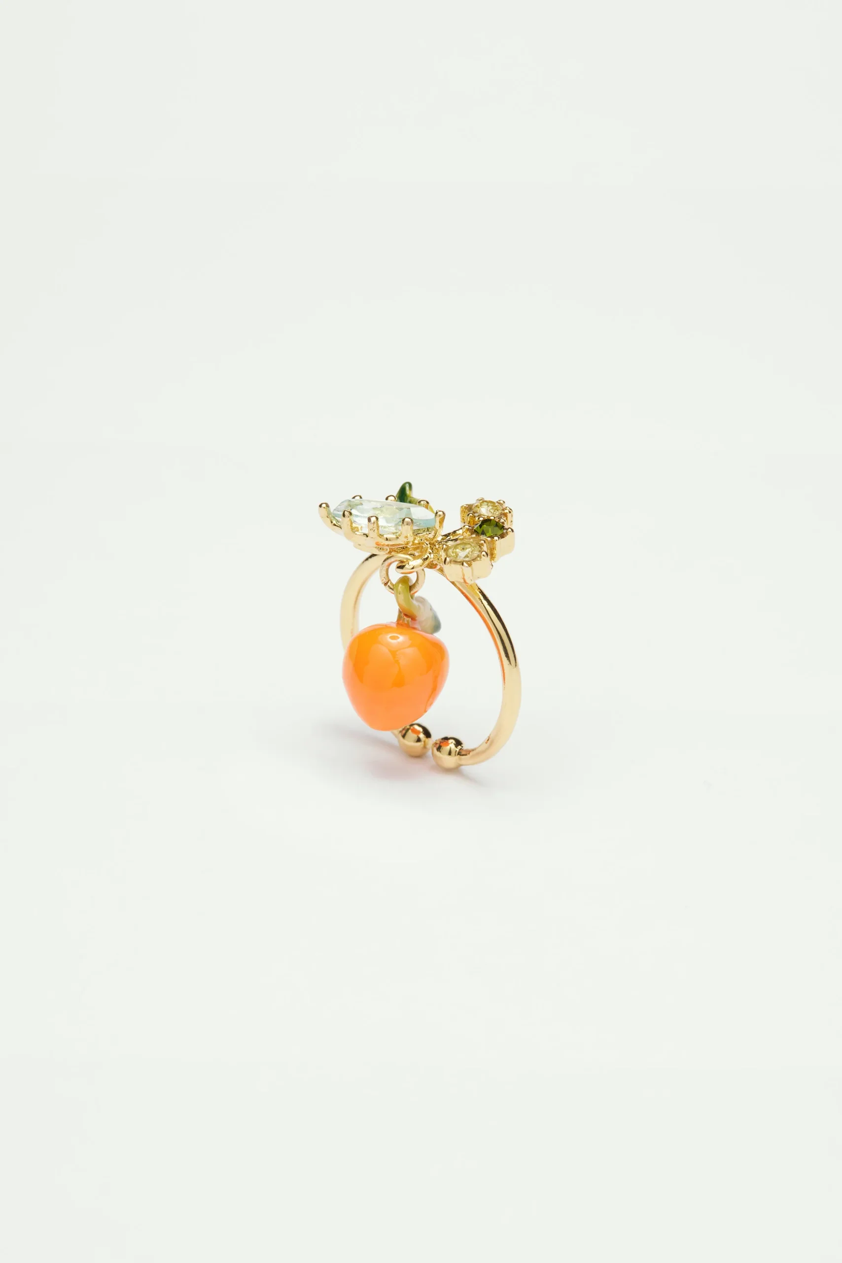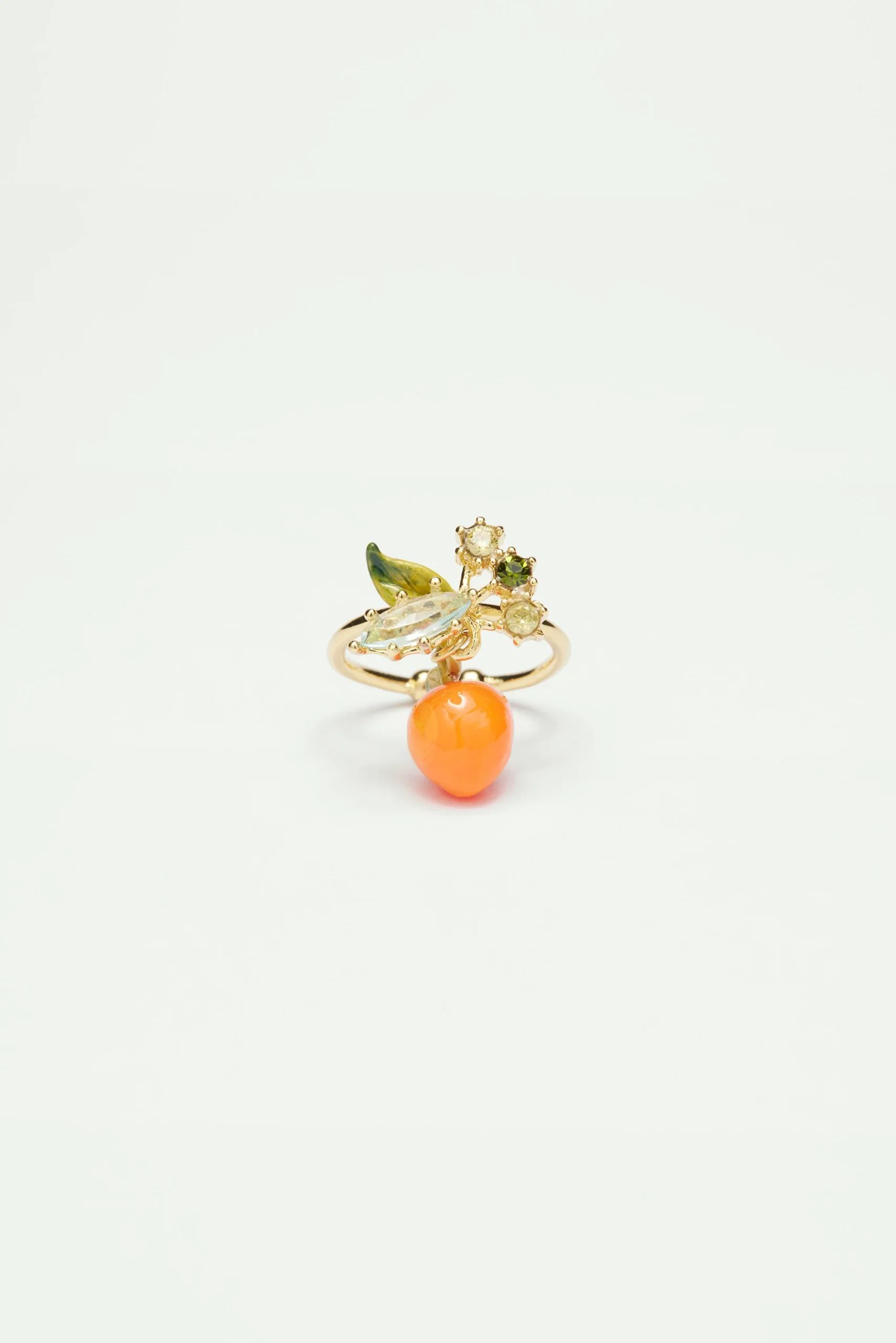 Le savoir-faire de la Maison Les Néréides au travers de la Collection Jardin de Provence est dévoilé avec ces bijoux fleuris qui révèlent une nature époustouflante. La Bague ajustable orange et petites pierres est réalisée en laiton peint à la main, accompagnée d’un verre bleu ciel taillé en son centre et de son fruit suspendu. La bague est en laiton peint à la main et les éléments qui la composent sont réalisés en résine 3D.