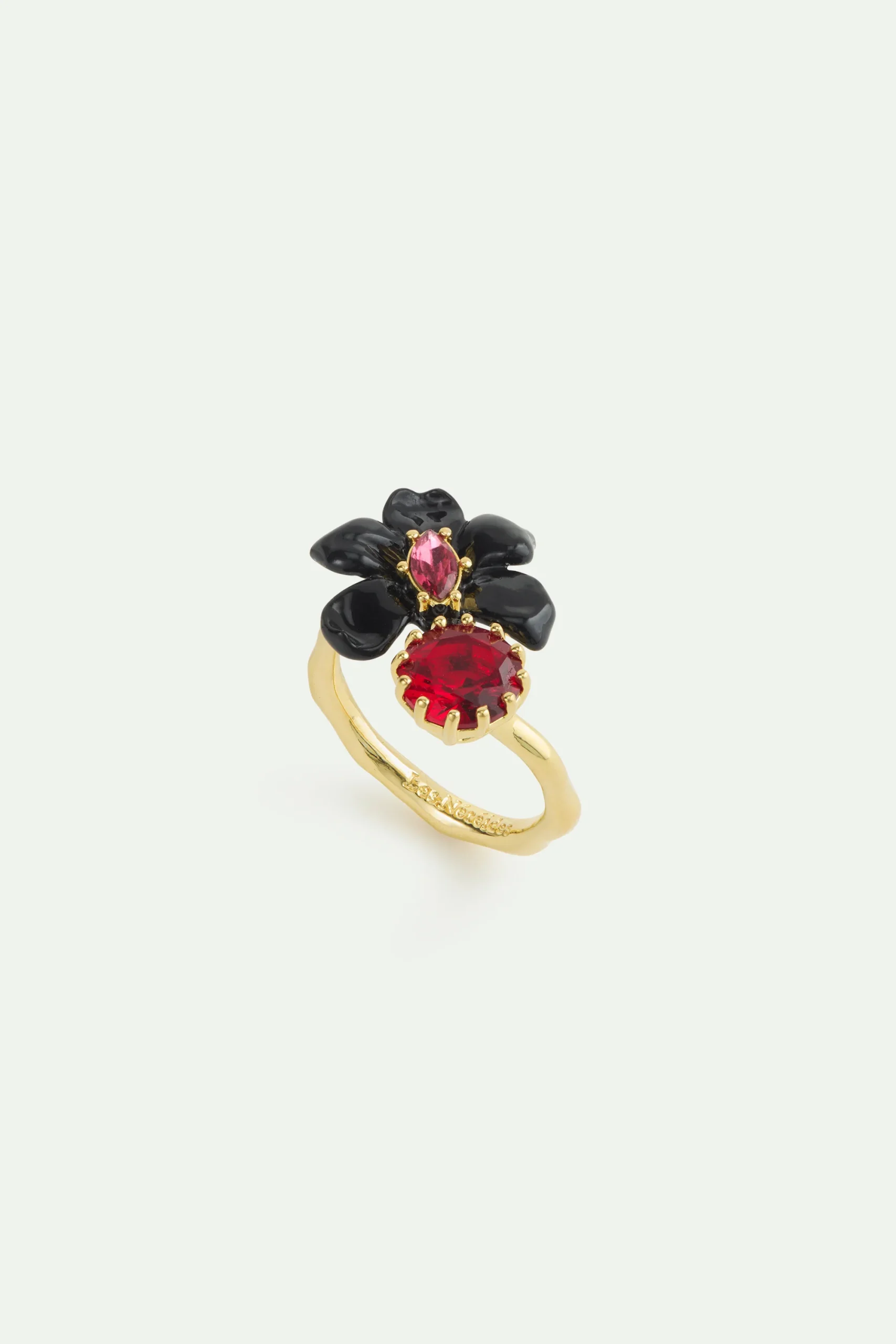 Bague ajustable orchidée noire peinte à la main, cristal facetté rose et pierre en verre facetté rouge grenat, en laiton dorée à l’or fin. La collection Cabinet Curiosité puise son inspiration dans l’univers fascinant du Muséum d’Histoire Naturelle de Paris. Un voyage onirique parmi orchidées rares, coraux flamboyants et coléoptères étincelants, comme un regard émerveillé posé sur les mystères du vivant.