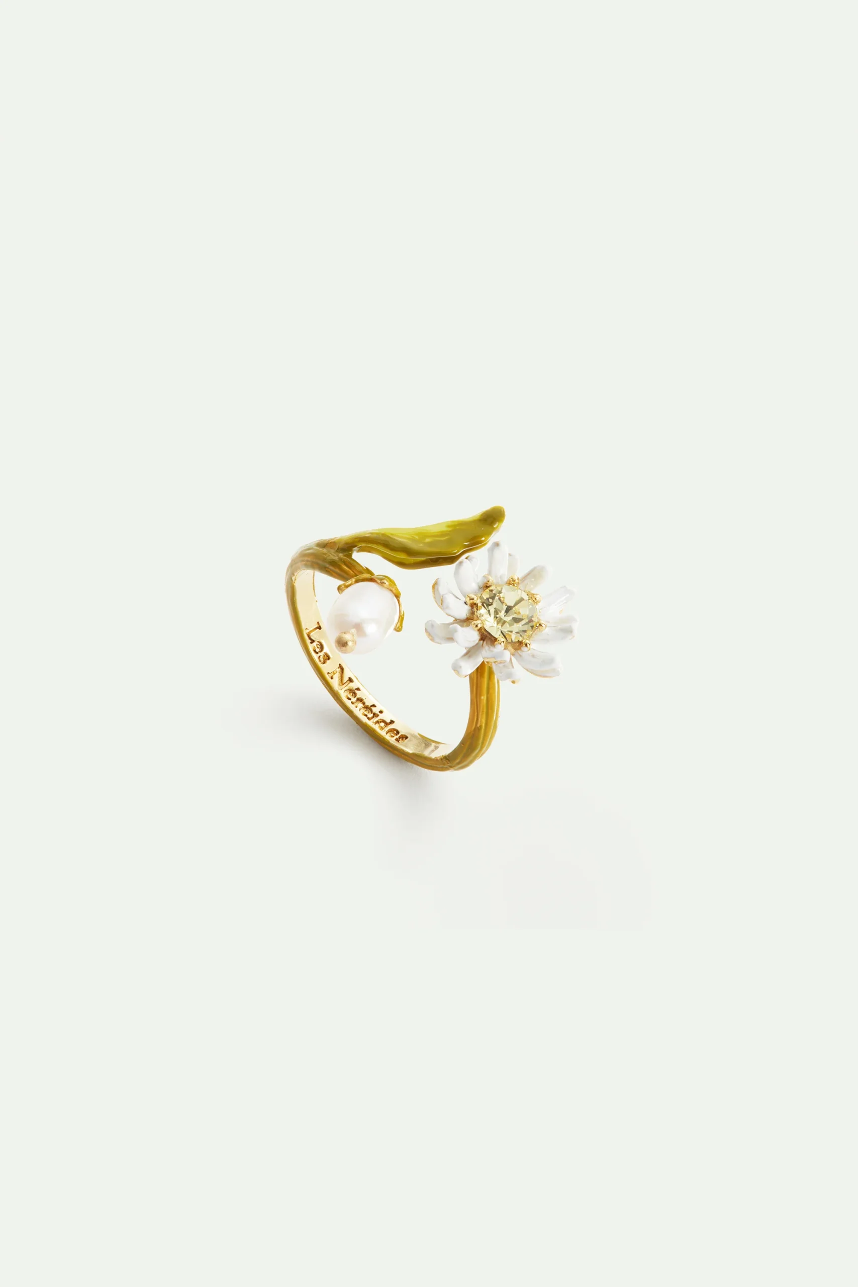 Bague ajustable en laiton doré blanche et verte peinte à la main, cœur en cristaux, perle nacrée. La collection Fleur de Roche invite à une promenade en montagne à la belle saison. Les fleurs naïves et simples poussent parmi les roches. Des détails techniques empruntés à l’escalade se mêlent aux bijoux.