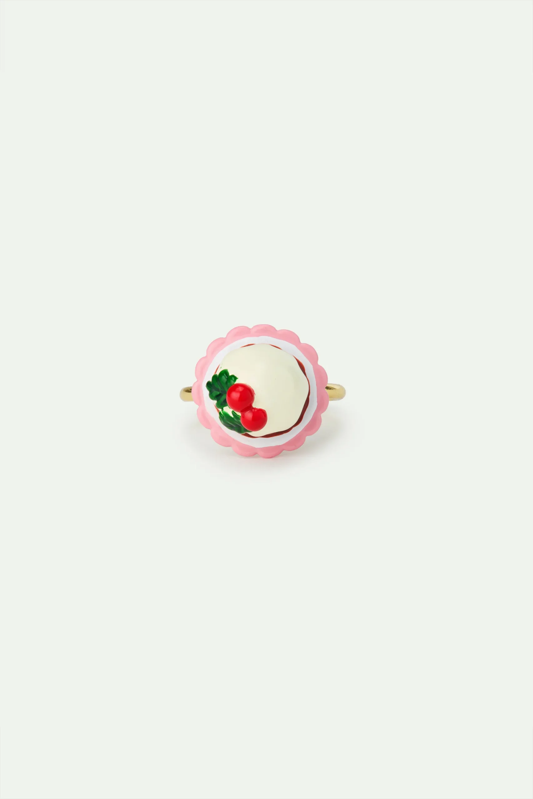 Bague ajustable en laiton doré à l’or fin accompagnée d’un pudding peint à la main et d’une perle de cristal facetté rouge.