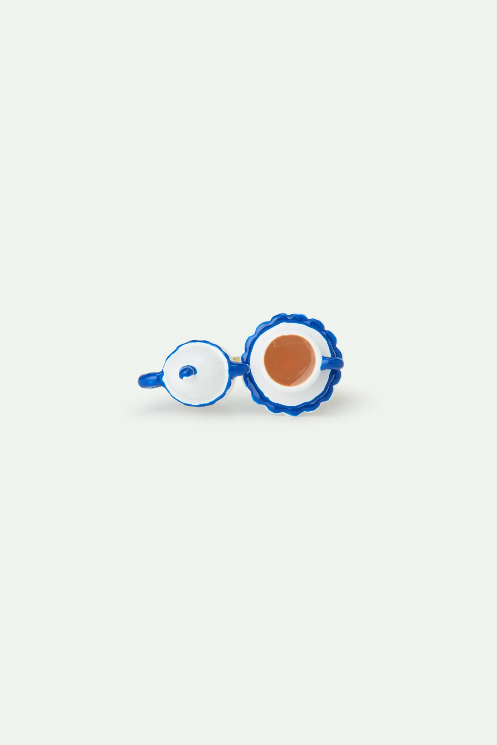 Bague ajustable tasse avec soucoupe et sa théière bleues et blanches peintes à la main, pierre pendante en verre facetté jaune en forme de goutte de thé.