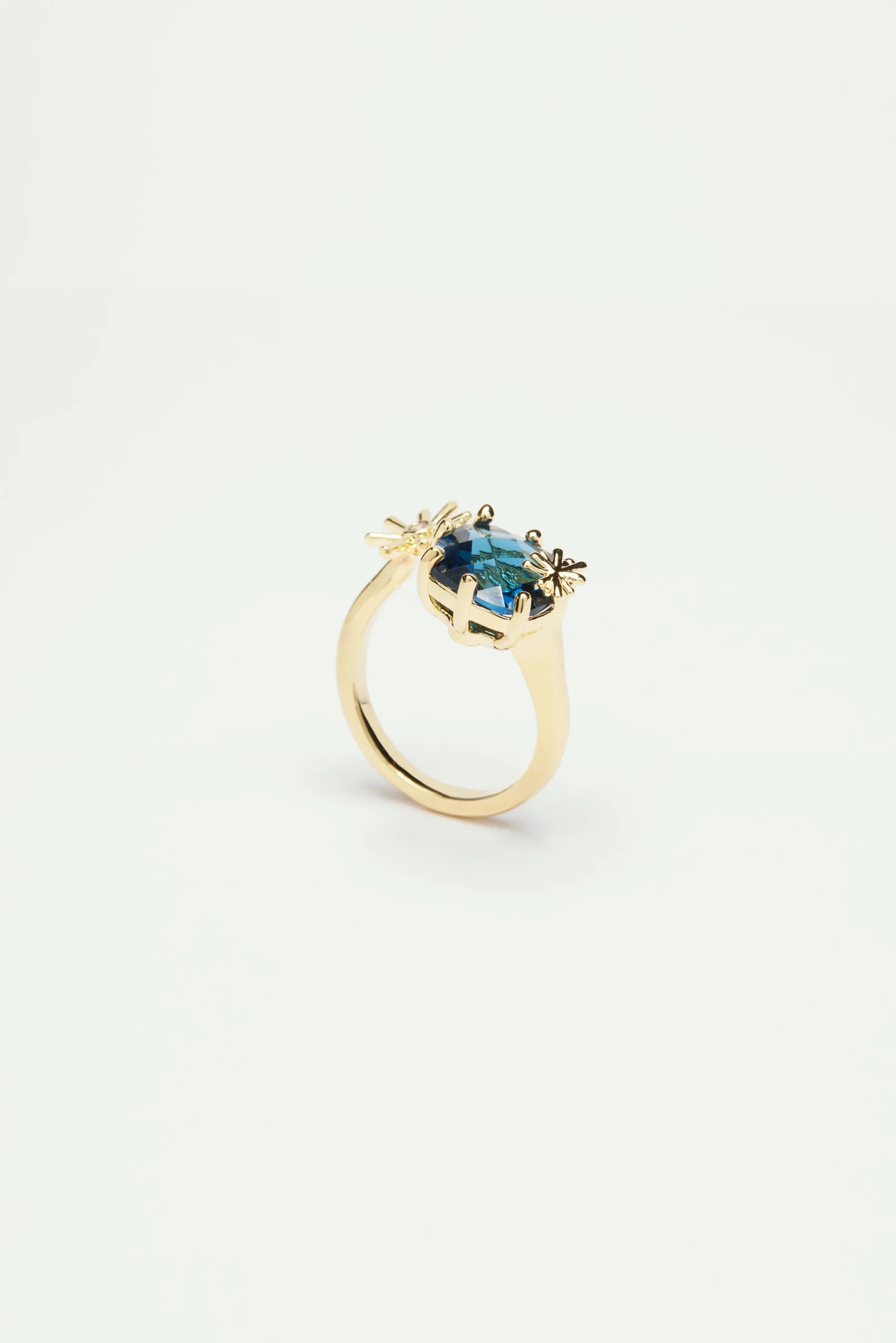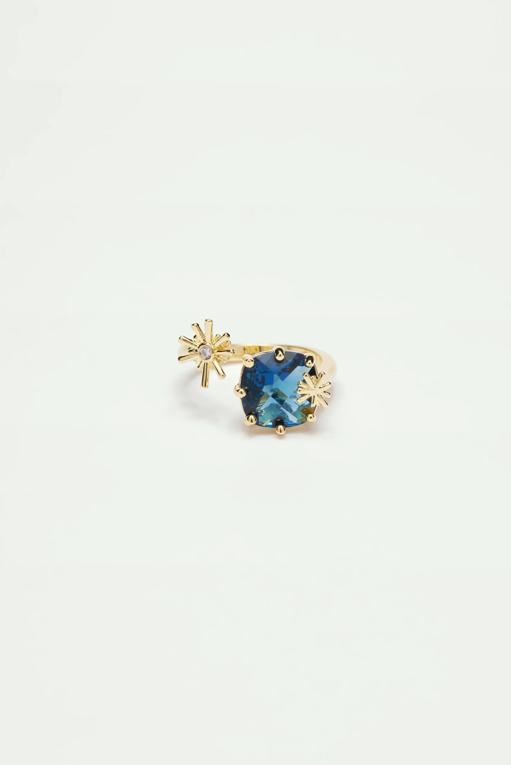 Explorez la collection Nuit Étoilée avec notre magnifique bague ajustable étoiles dorées et pierre carrée. Sur cette bague fantaisie se trouve aux extrémités une étoile dorée avec en son cœur une pierre blanche en verre taillé et une pierre carrée de couleur bleu nuit. Vous pouvez porter cette bague à n’importe quel doigt en l’ajustant selon vos préférences. Cette bague s’accordera parfaitement avec les boucles d’oreilles étoiles dorées et pierre carrée, issues de la même collection. Bague Ajustable : laiton doré à l’or fin, peint à la main et verre taillé.