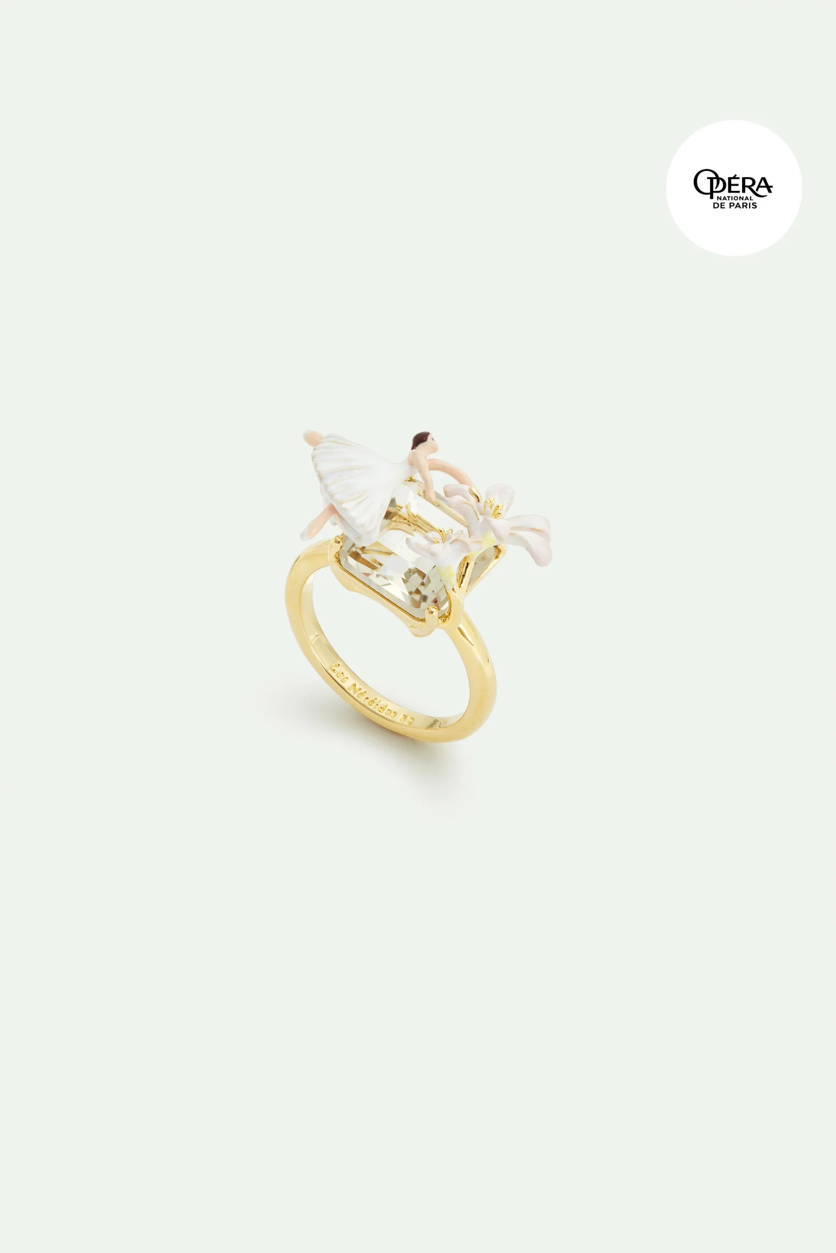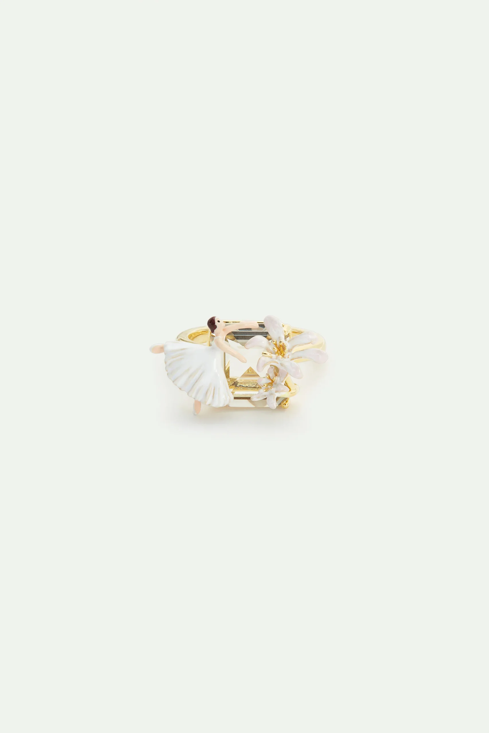 Bague pierre en verre facetté taille émeraude, ballerine en tutu blanc accompagnée d’une fleur de lys blanche peinte à la main. Pour célébrer les 150 ans du Palais Garnier, la Maison les Néréides a conçu des parures imprégnées de l’esprit de l’Opéra. Cette collection vous mène à la rencontre du plus romantique des ballets, ici mis à l’honneur : Giselle.