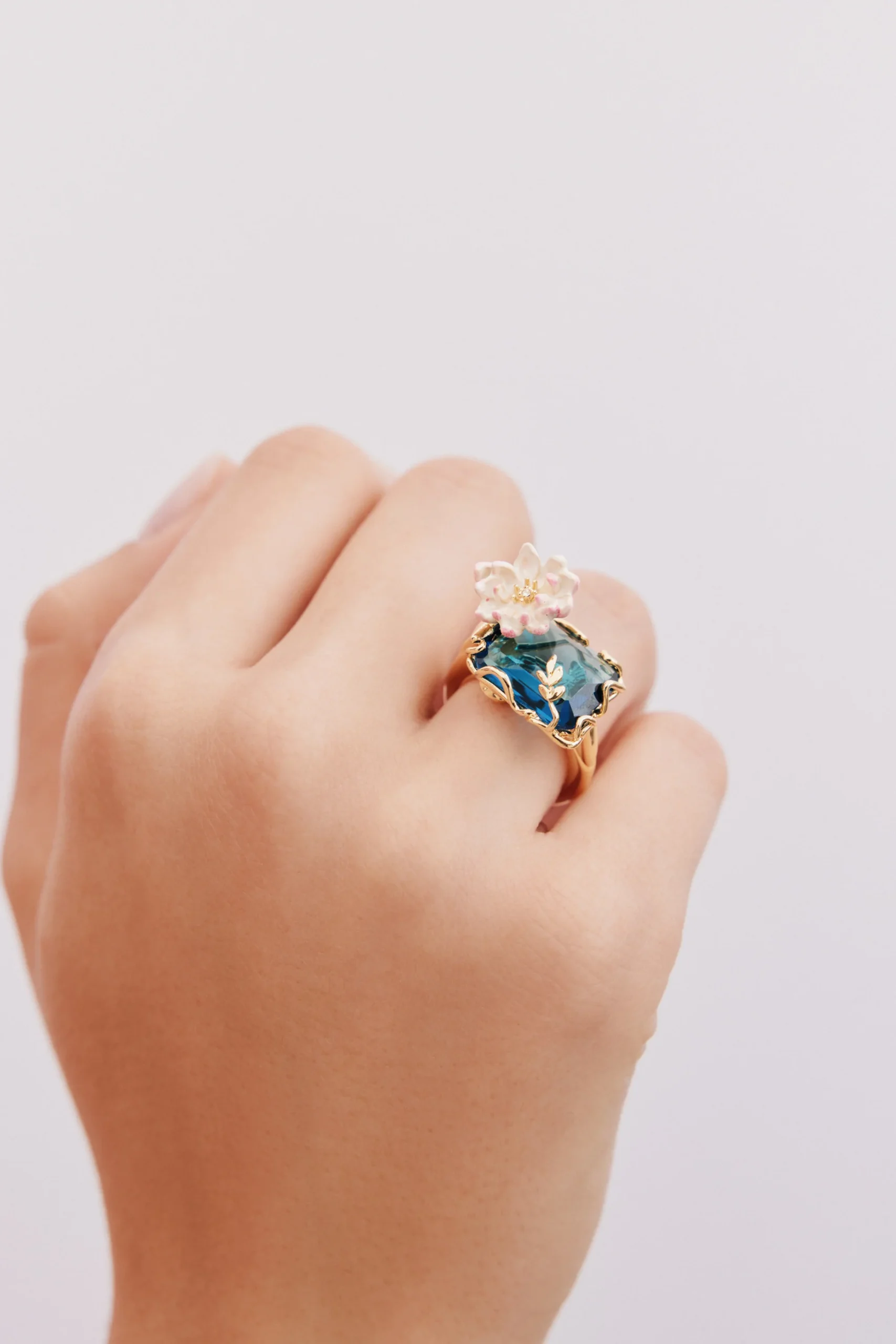 Bague cocktail pierre taille émeraude en verre facetté bleu clair translucide, ornée d’une petite fleur de nymphéa rose peinte à la main et d’un cristal blanc, feuilles et fleurs de lotus en laiton doré à l’or fin.