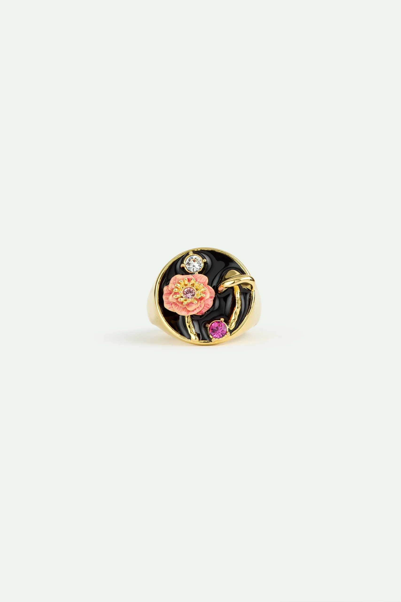 Bague chevalière évoquant une scène de forêt sur un tableau, ornée d’un champignon et d’une fleur d’anémone peints à la main, et de cristaux violet et blanc, sur fond de laque noire.