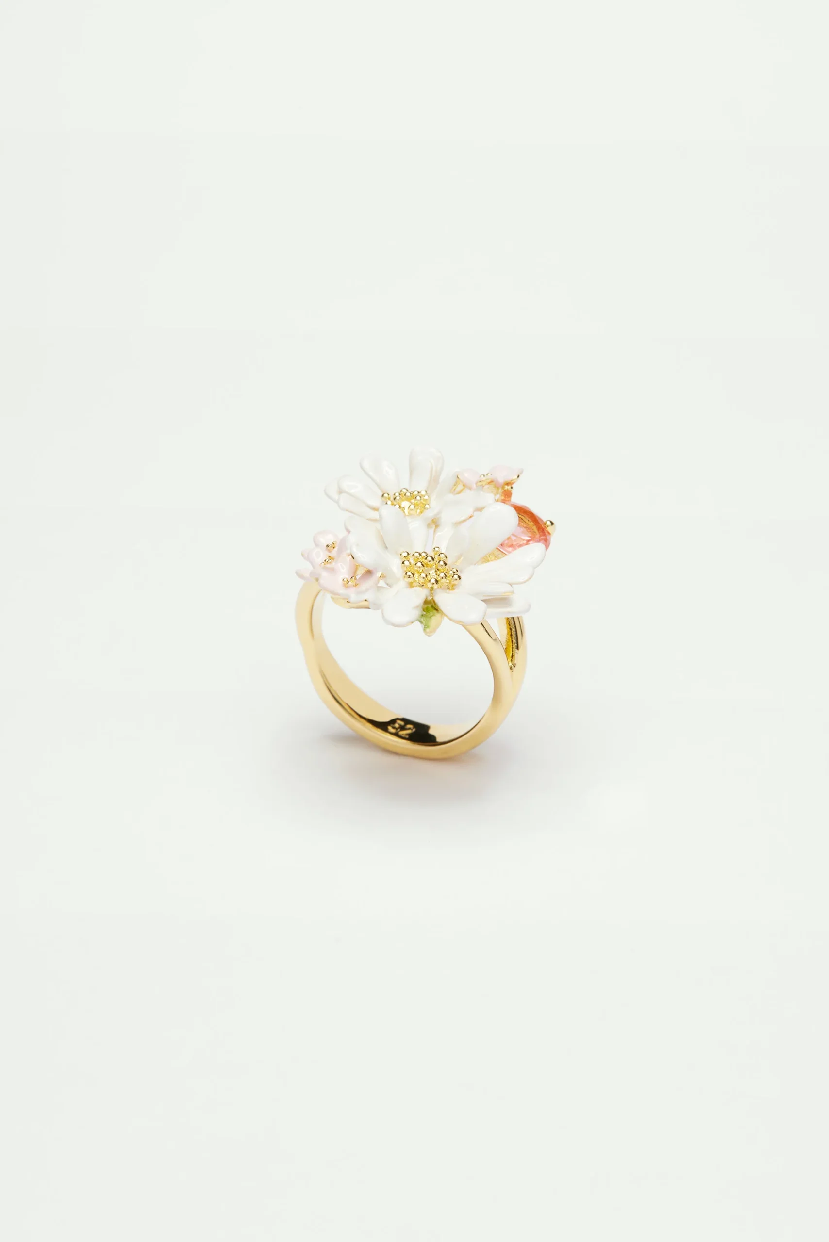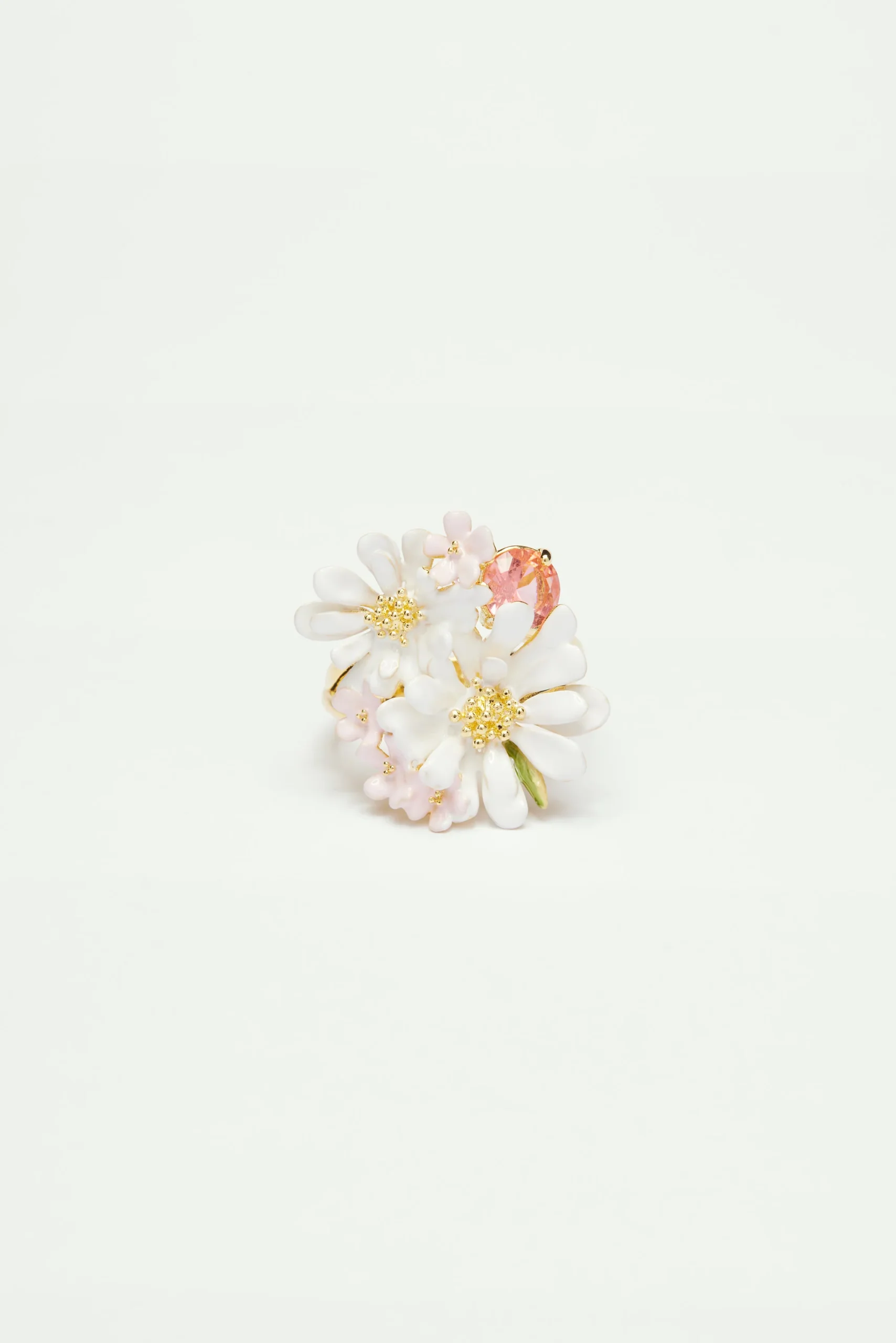 Bague cocktail bouquet de fleurs d’Orlaya blanches et fleurs de verveine roses, pierre ronde rose en verre taillé, laiton doré à l’or fin. Suite de la visite du musée d’Orsay avec Jeune Femme en Toilette de Bal de Berthe Morisot, une des femmes peintres du mouvement impressionniste que la Maison Les Néréides souhaite mettre en valeur. La palette du tableau est interprétée à travers un motif floral dans une série de pièces que l’on pourrait imaginer cette jeune femme porter. Collaboration Les Néréides x Musée d’Orsay