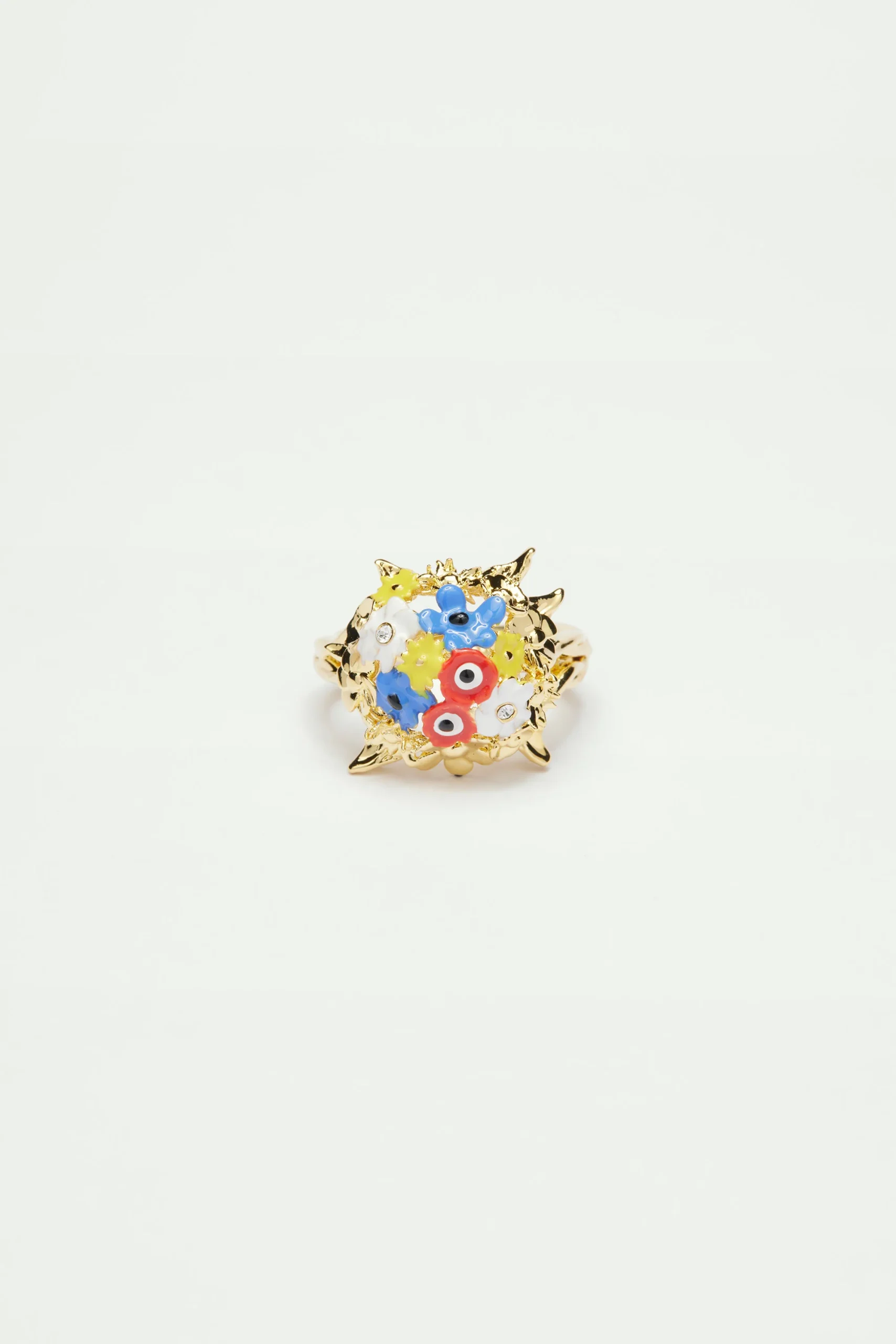 Cette bague cocktail fusionne la splendeur d’un bouquet floral en une brillance précieuse. Elle est d’une délicatesse inouïe et étincelle comme un bouquet de fleurs en plein épanouissement. En son cœur, un agencement harmonieux de pétales de différentes couleurs certains pavés de bleu évoquant le ciel d’été, d’autres ornés de jaune vibrant comme les rayons du soleil. Les teintes s’entrelacent avec grâce créant une symphonie de couleurs qui évoque la fraîcheur du printemps. C’est un bijou original qui habillera vos mains avec élégance.