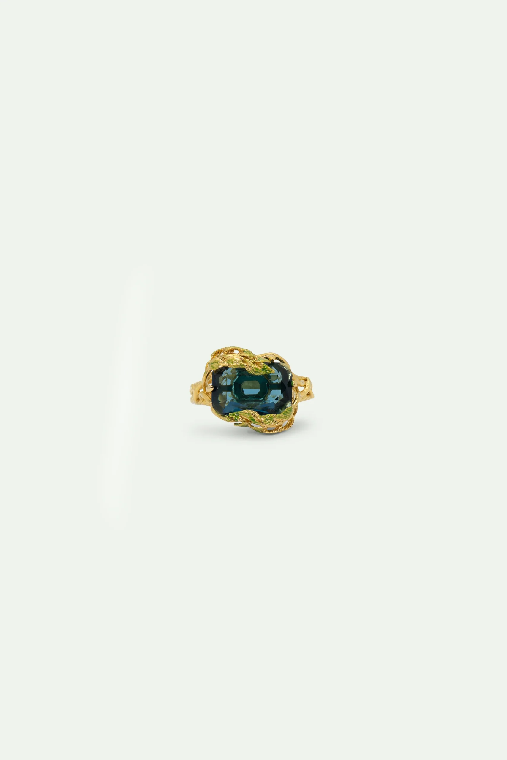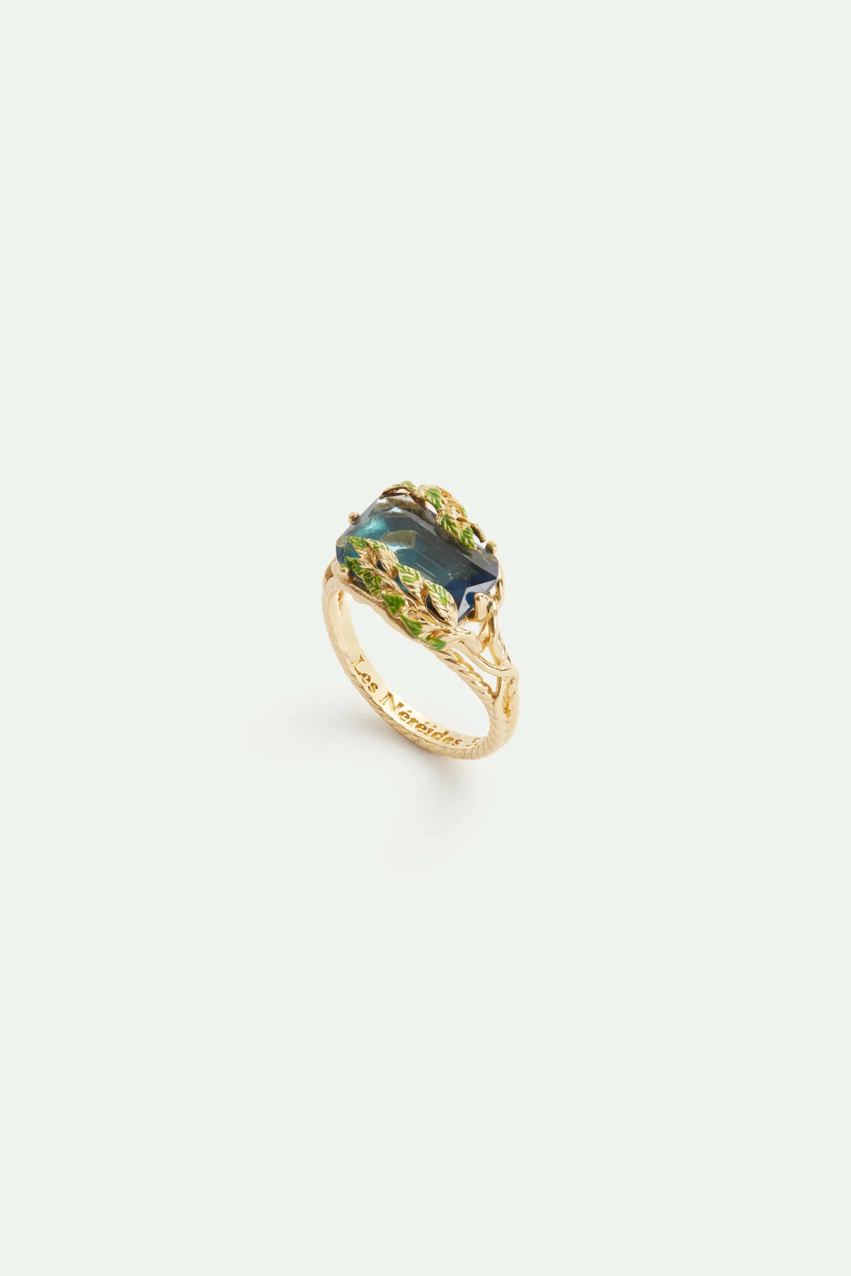Bague cocktail ornée d’une pierre de verre facettée de couleur bleue, entourée de feuilles de glycines. La monture est en laiton doré à l’or fin. Ses fleurs semblables à une nuée de papillons prennent des teintes bleutée et font les délices des abeilles.