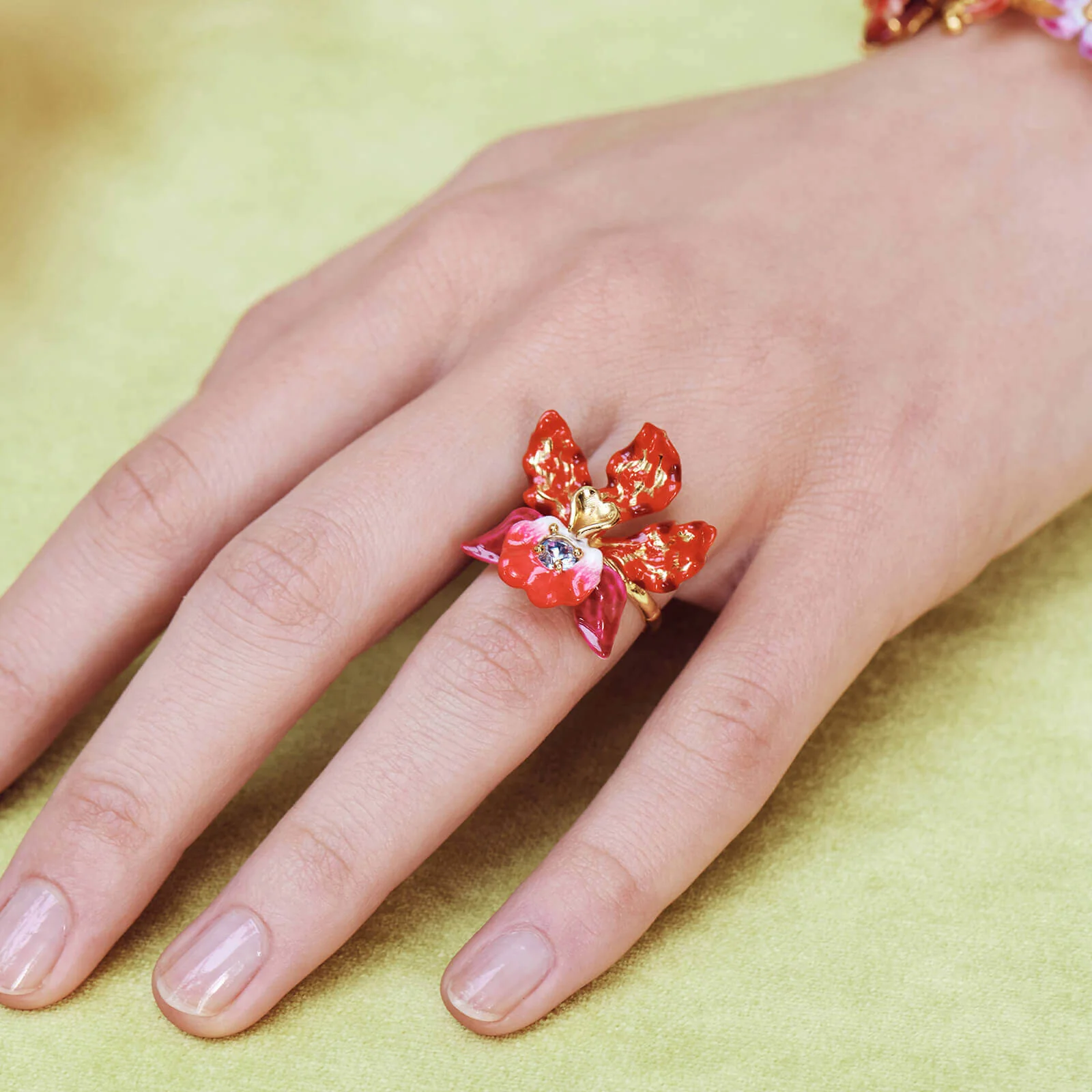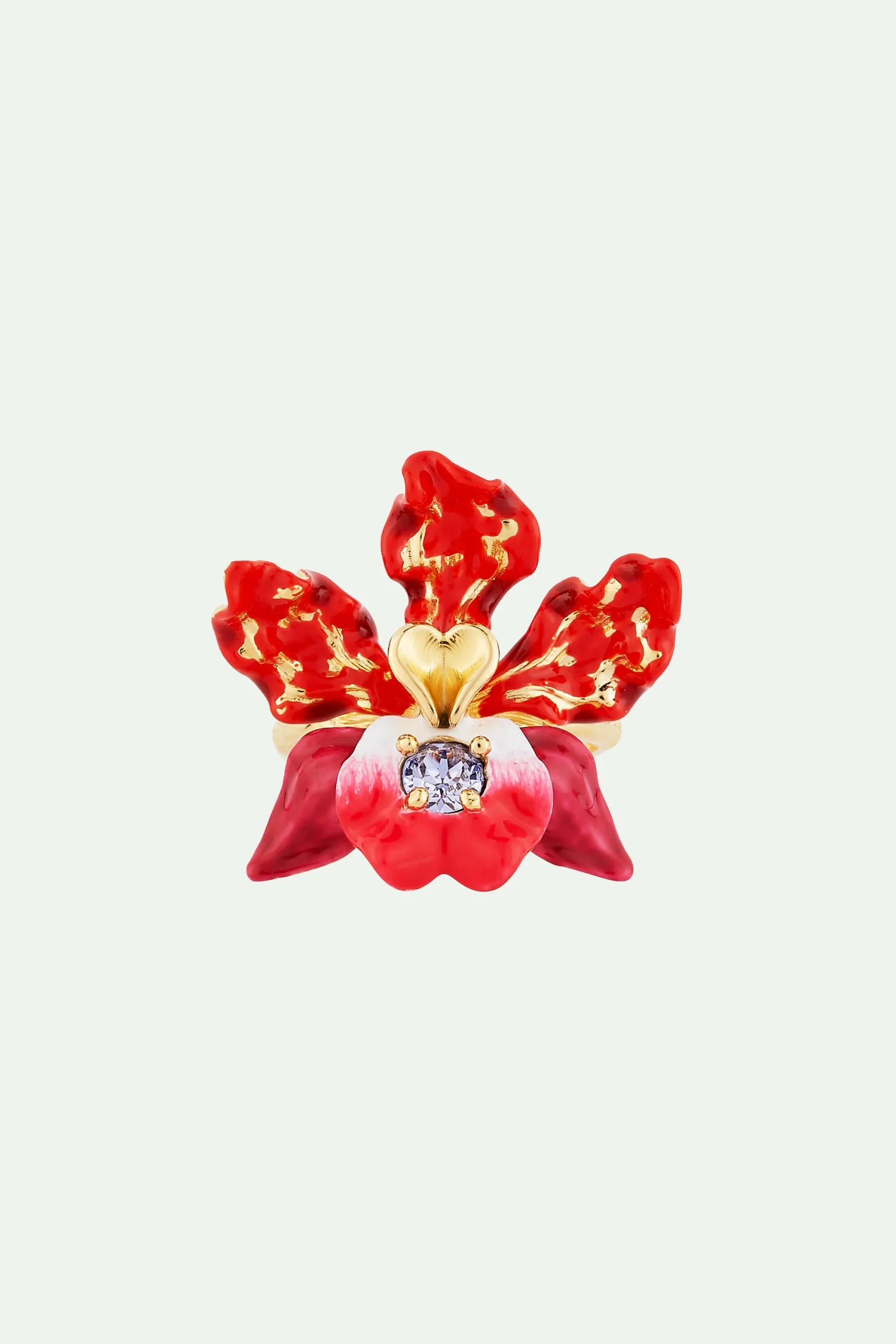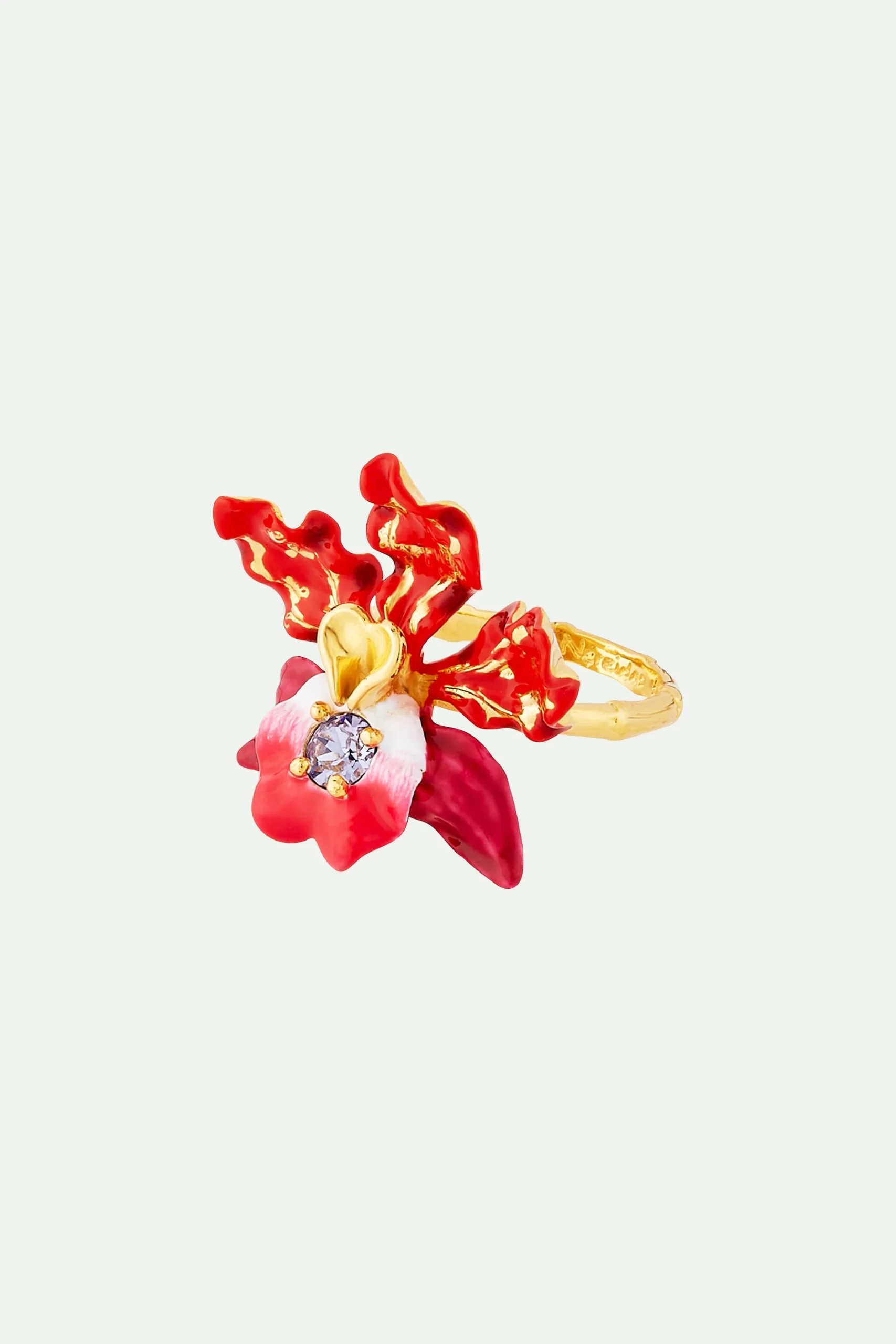 Bague cocktail fleur d’orchidée exotique et cristal taillé