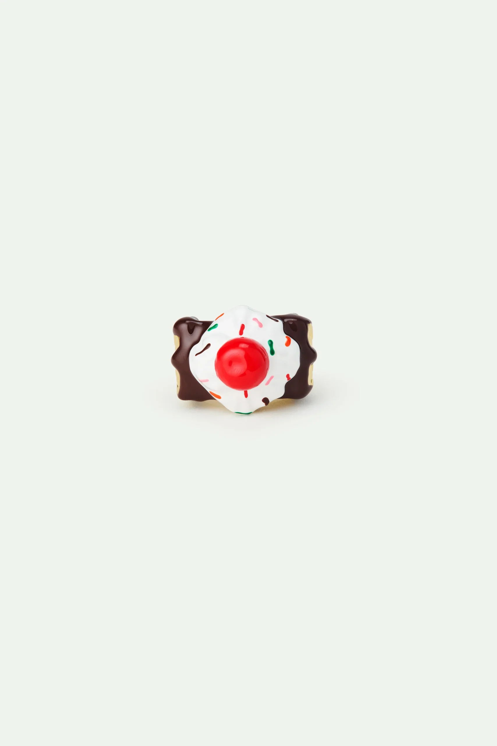 Bague cocktail glace chocolat chantilly délicatement peinte à la main. La collection Hansel et Gretel revisite avec malice le célèbre conte, où friandises sucrées et maison de pain d’épices séduisent autant qu’elles piègent. Parés d’anneaux et amulettes protectrices, nos héros affrontent la sorcière dans un univers gourmand et enchanté, entre douce tentation et magie salvatrice.