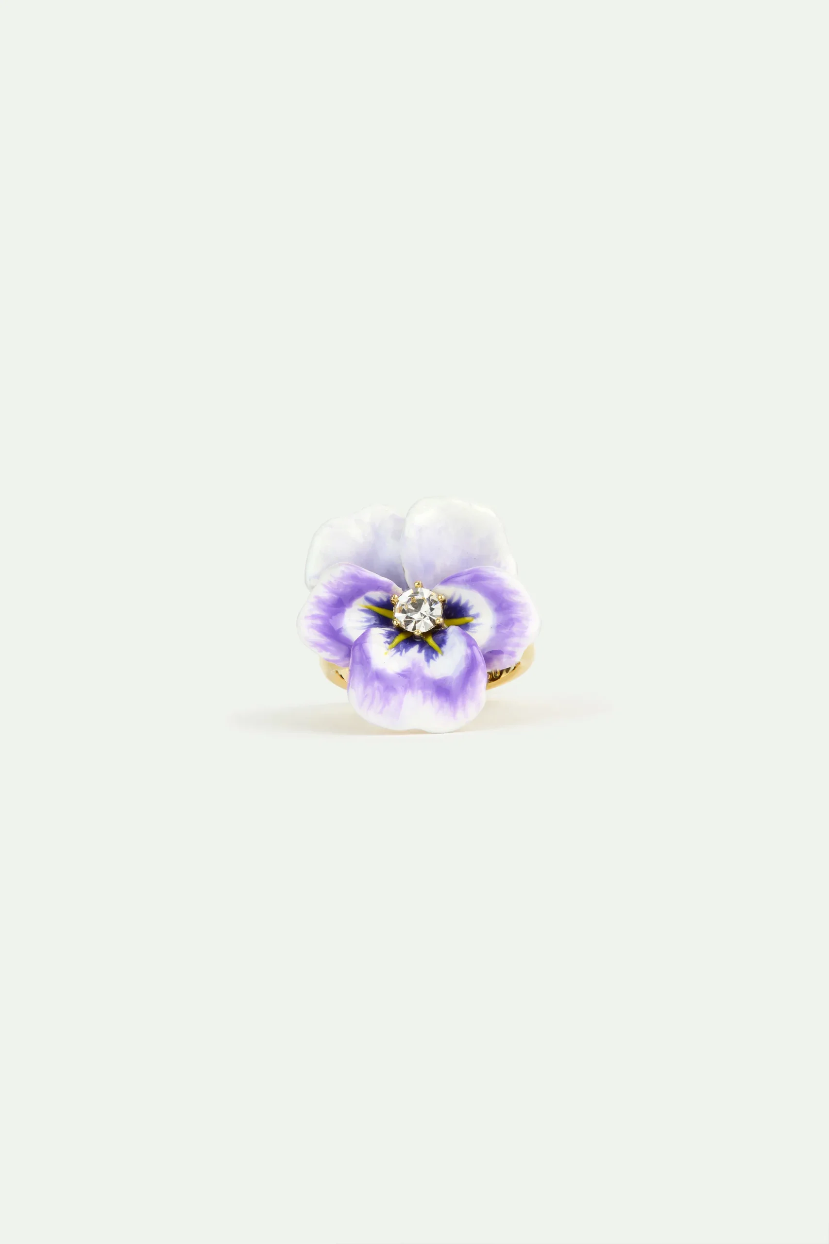 Bague cocktail pensée violette peinte à la main et cristal taillé en laiton doré à l’or fin. La collection Mille Pensées décline la douceur d’une pensée intemporelle, avec ses fleurs aux teintes crépusculaires mêlant bleu et violet. À la frontière du jour et de la nuit, ces bijoux capturent l’émotion muette et l’apaisement, révélant ce que seul le cœur sait dire.