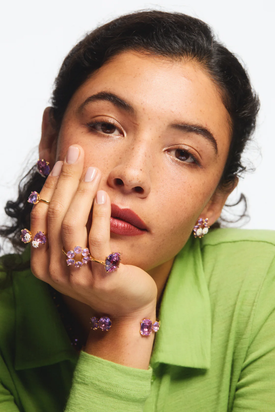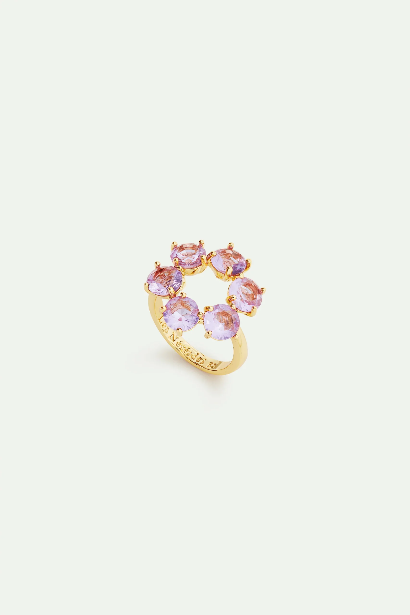 Bague fine six pierres rondes en verre facetté violet, disposées en forme de couronne. L’élégante Diamantine se transpose cette année en Provence. La collection revêt le raffinement bucolique d’une prairie où marguerites et lavandes aromatiques ondulent dans le vent. Une parure féminine composée de pièces aux nuances douces qui nous renvoient à la quiétude d’un rayon de soleil rasant les tonnelles.