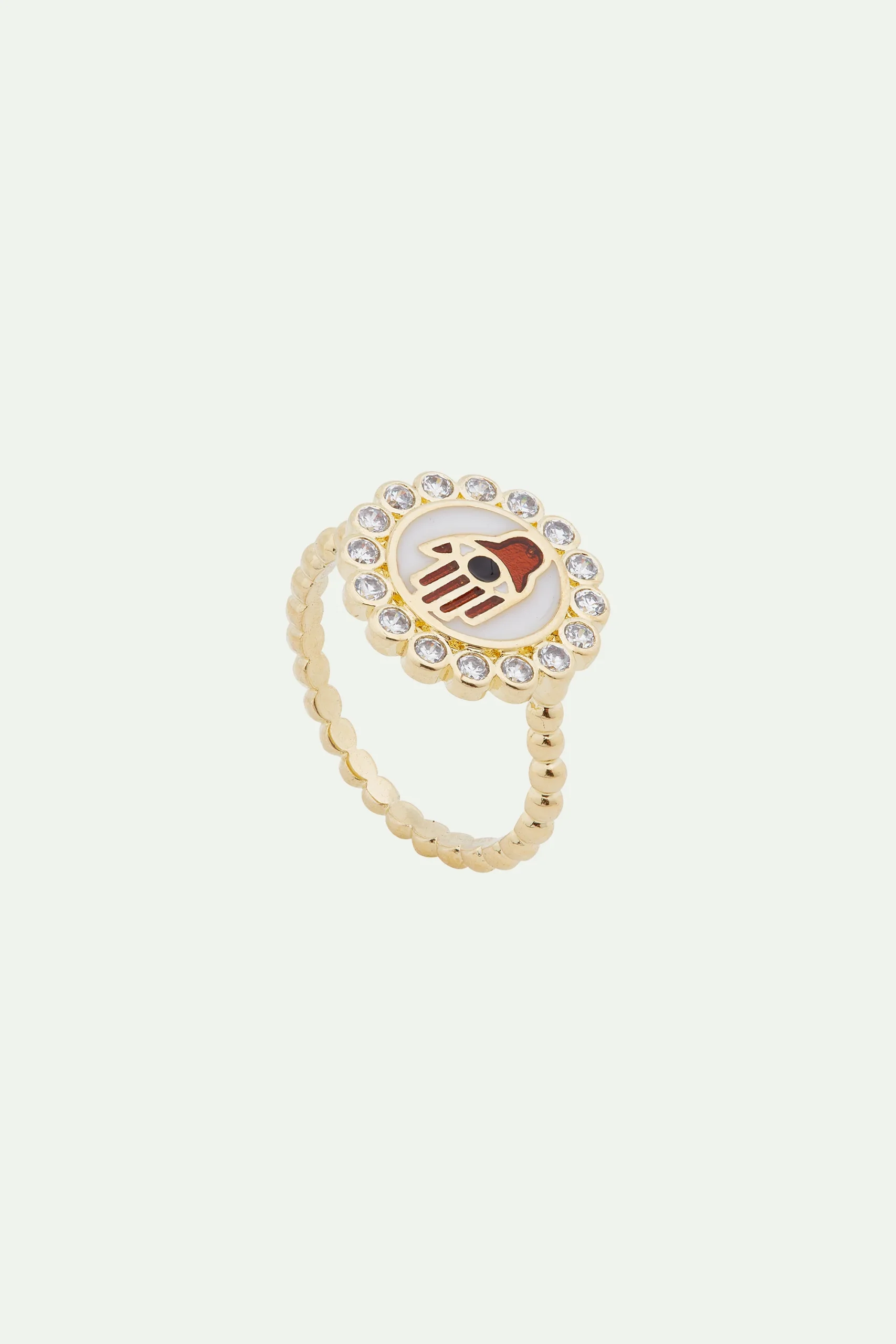 La bague main de Fatma de la Collection Art Divinatoire est ronde, ornée de petits cristaux. Son anneau est formé de petites perles dorées. Le scintillement des cristaux forme un cercle lumineux tout autour de la main de Fatma. Cette dernière a été réinterprétée par La Maison Les Néréides en un version plus contemporaine. Bague : laiton doré à l’or fin, peint à la main et cristaux facettés.