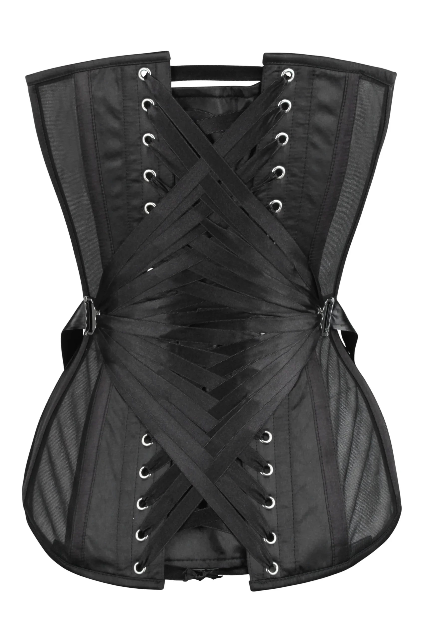 - Caractéristiques du corset : laçage de ruban de ventilateur, panneaux en maille, busk en acier