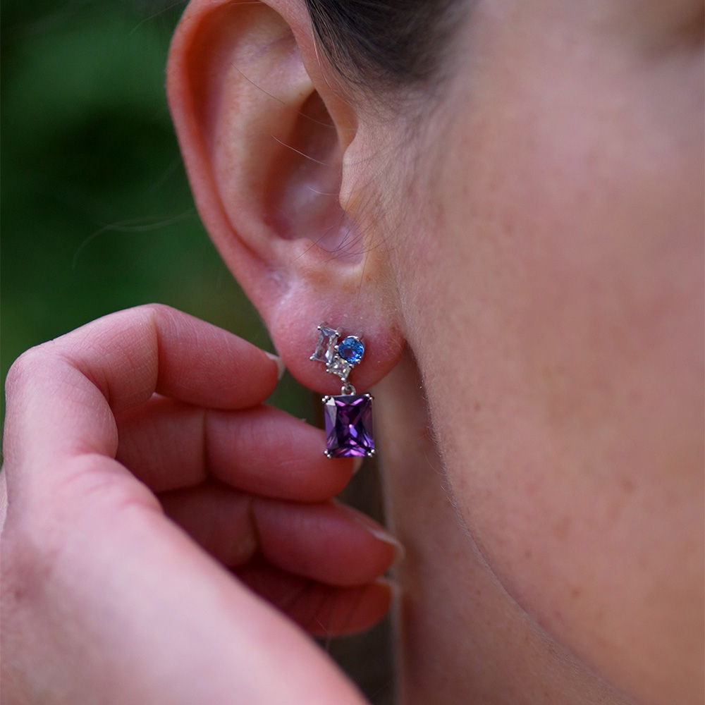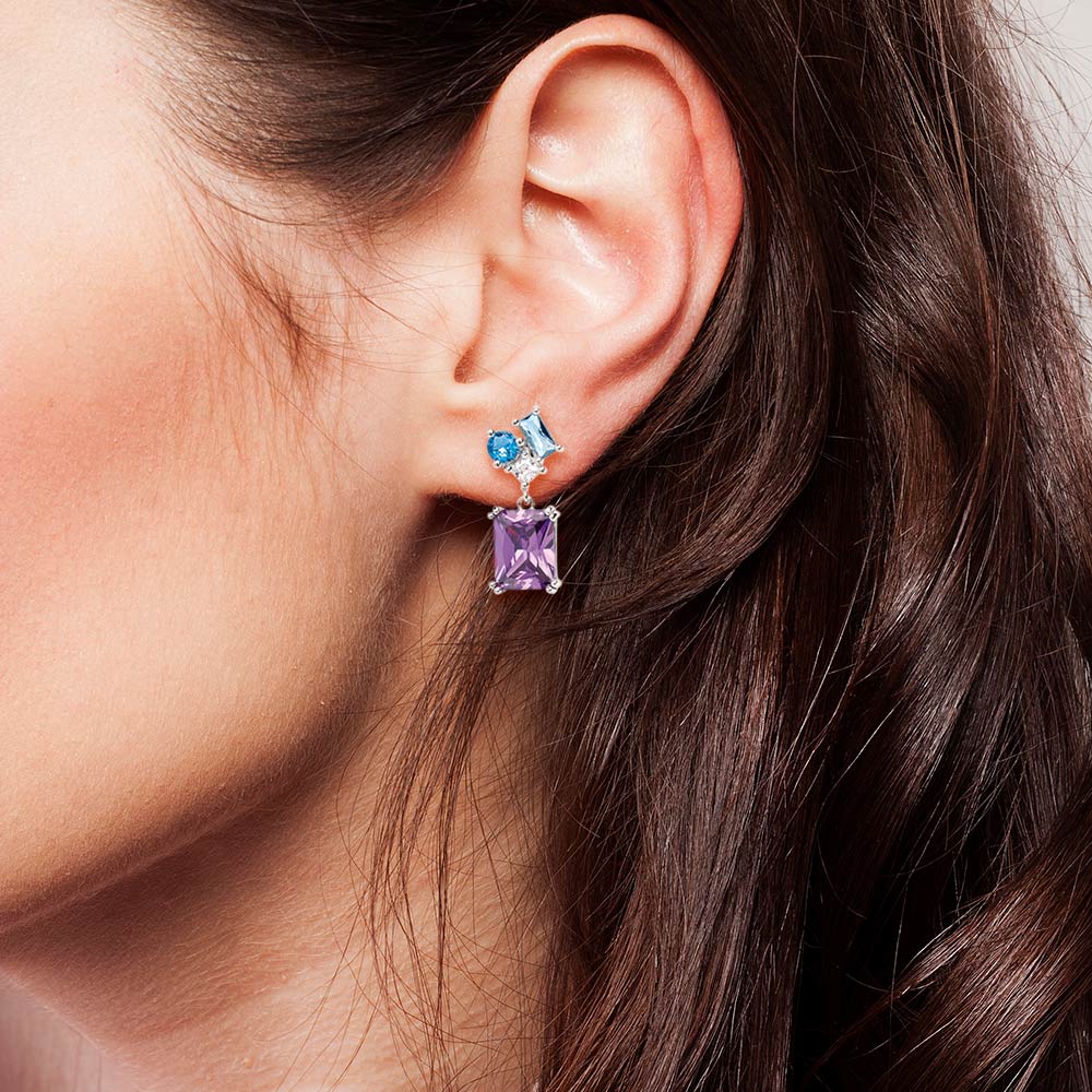 Conçues pour les oreilles percées, ces boucles d’oreilles à l’accord parfait entre l’argent et le Violet, bleu, blanc sauront illuminer la femme audacieuse et singulière qui est en vous !