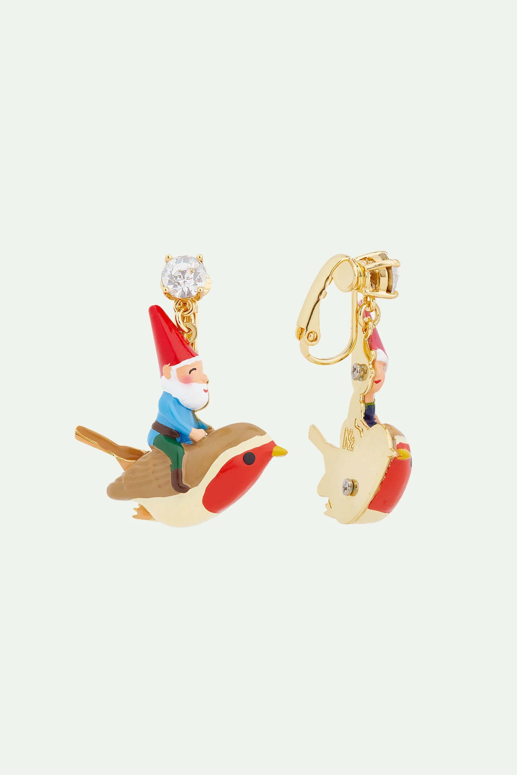 À travers ces boucles d’oreilles haute fantaisie, un couple de nains de jardin aussi attachants que drôles vous invite à une escapade à dos d’oiseau. Assis confortablement sur le dos d’un rouge-gorge, suivez leurs aventures grâce à la joyeuse collection Les Champimignon et ajoutez une touche de malice à vos tenues printanières. Boucles d’Oreilles : laiton doré à l’or fin, , cristal facetté et résine.