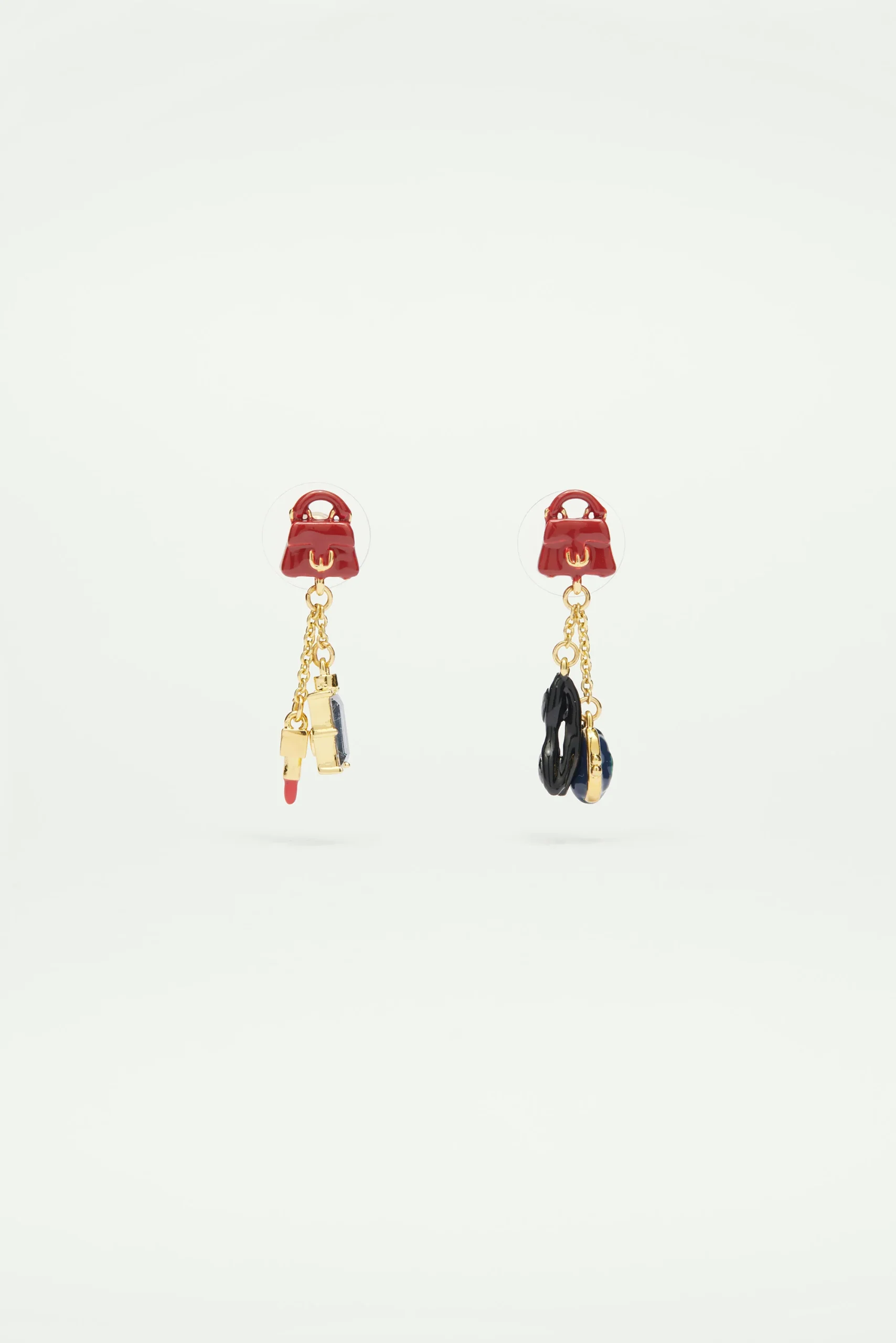 Boucles d’oreilles asymétriques, chaînes en laiton doré, petits objets peints à la main : sac à main rouge, portefeuille, lunettes de soleil, rouge à lèvres, cristal forme baguette. Embrassez ces souvenirs fantasmés de Paris à travers des images typiques de la vie des parisiennes. Une série de bijoux à ramener comme souvenirs de voyage.