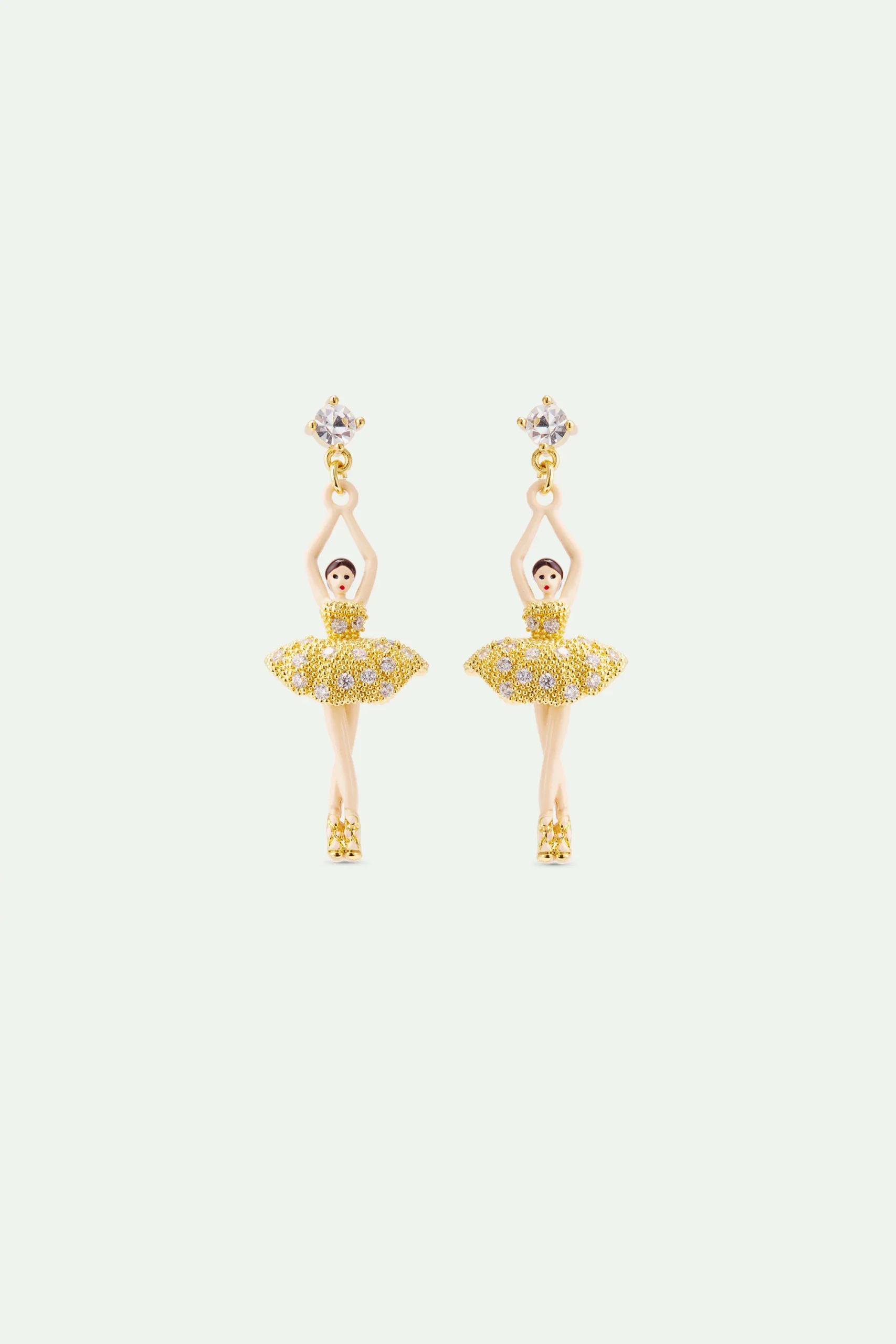 Boucles d’oreilles pendantes ballerine peinte à la main, vêtue d’un tutu de perles de laiton doré à l’or fin et d’oxydes de zirconium, ornée d’une pierre ronde blanche en verre taillé.