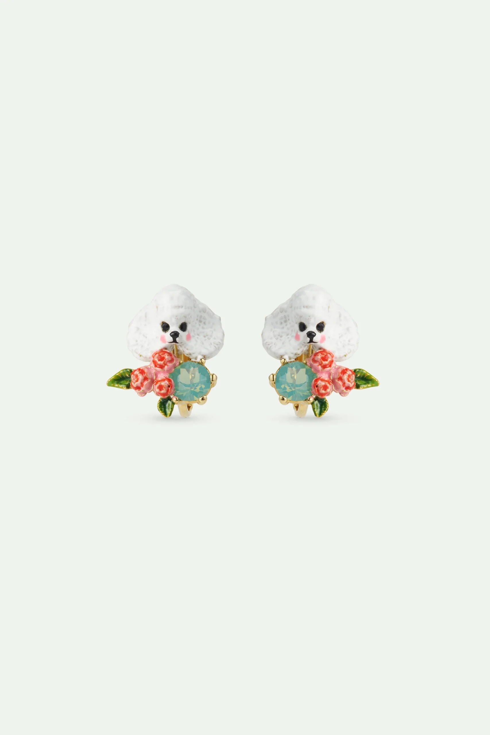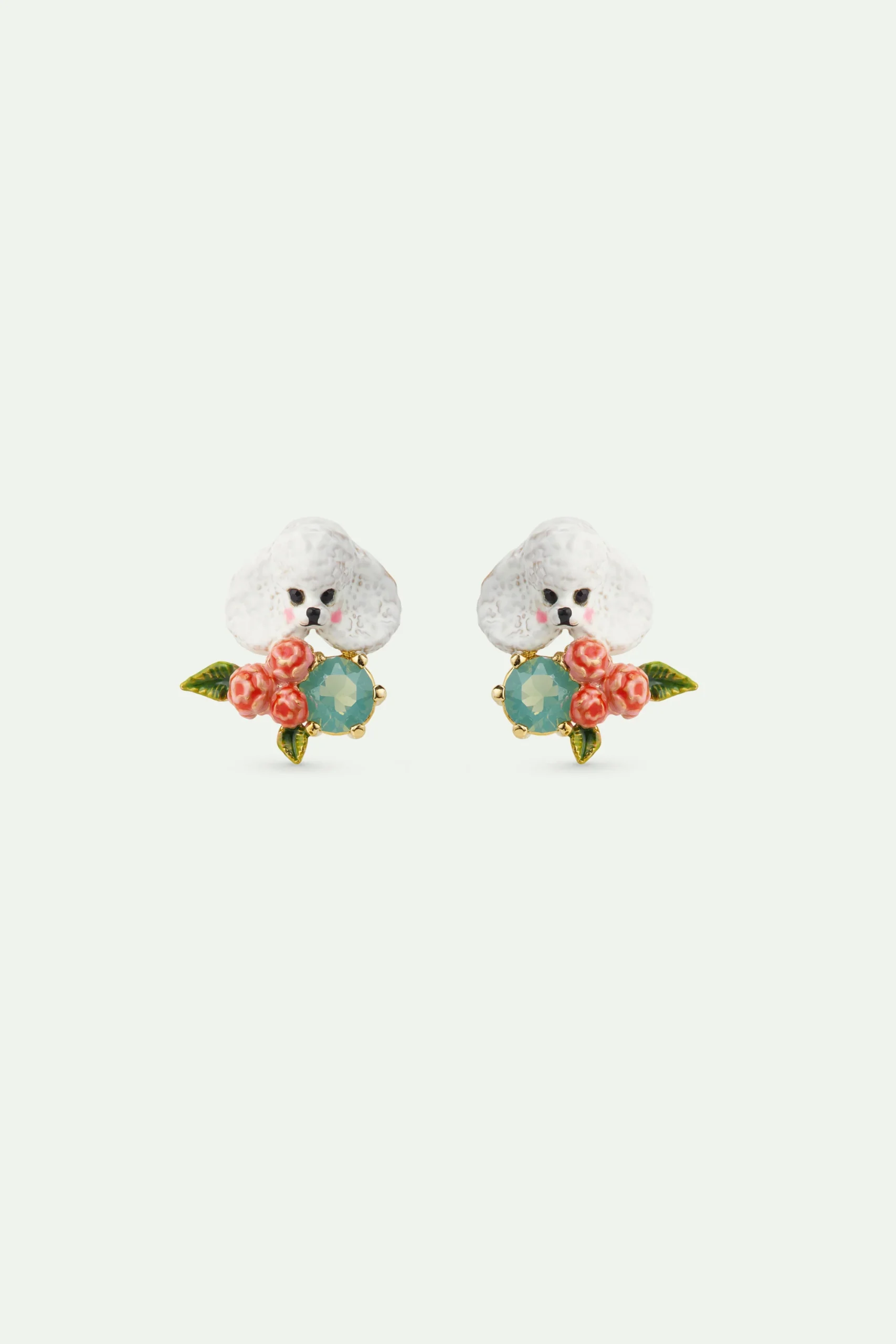 Boucles d’oreilles chien caniche blanc accompagné de fleurs roses et d’une pierre en verre facetté bleu. Laiton doré à l’or fin. Cette saison, Les Néréides Loves Animals nous conte une balade dans Paris, en compagnie de trois chiens emblématiques, un caniche, un teckel et un dalmatien. 15% des recettes de ces bijoux sont reversées par la fondation LNLA à des associations qui œuvrent pour le bien-être animal à travers le monde.