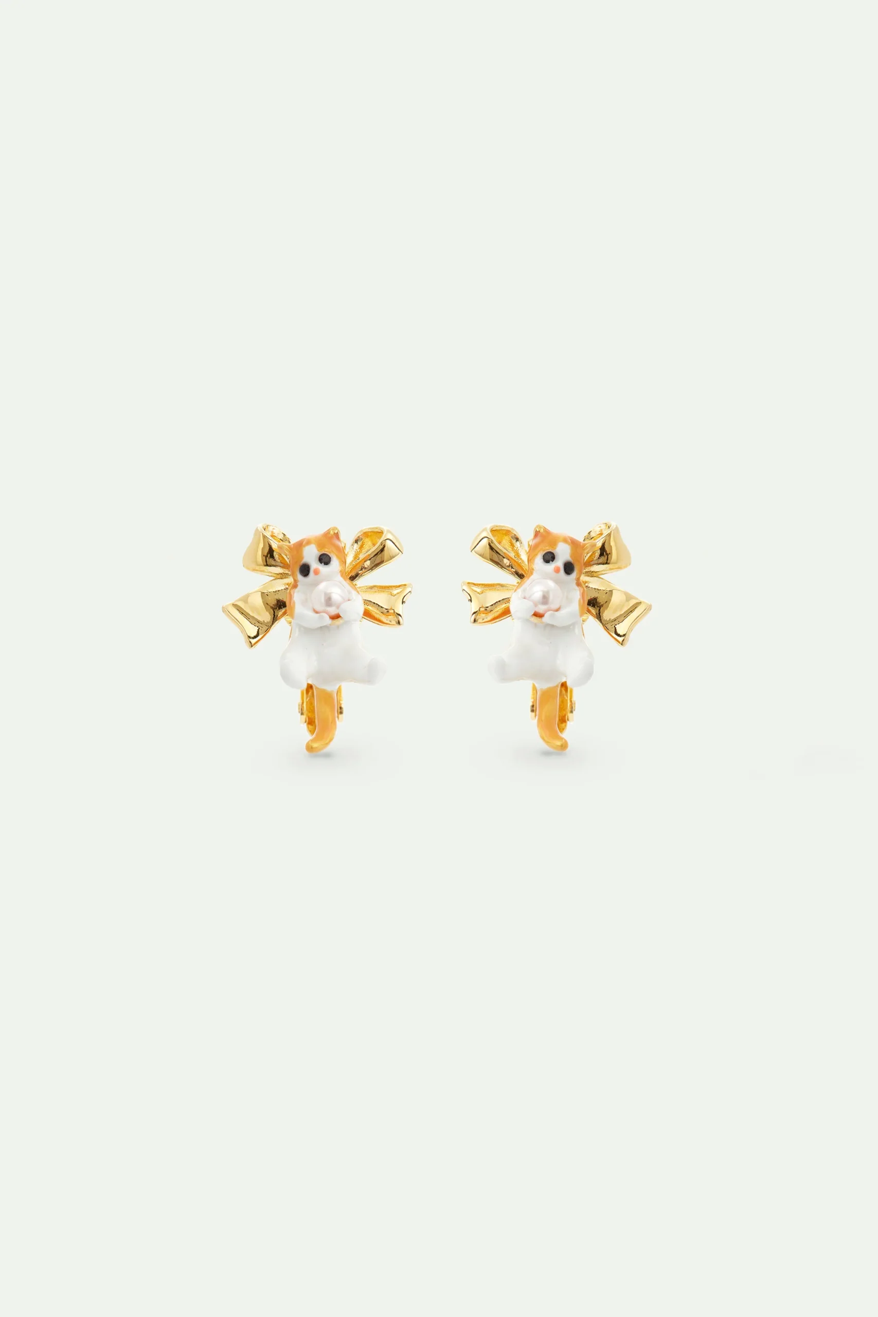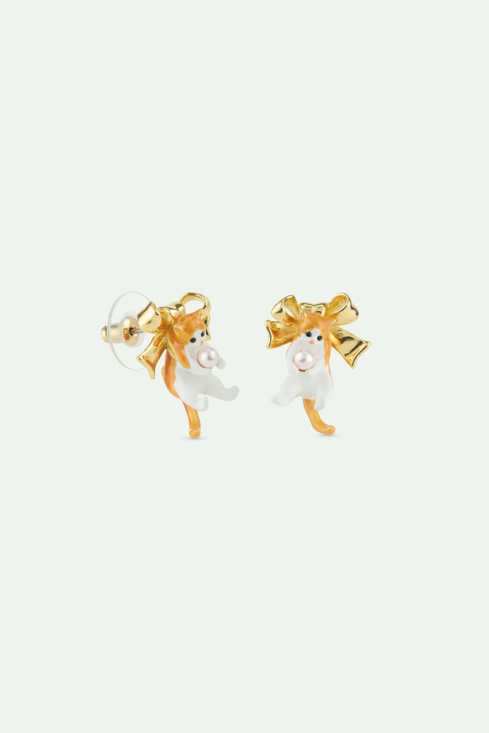 Boucles d’oreilles chaton roux et son noeud doré à l’or fin, tenant une perle de culture nacrée blanche. Pour la réédition de la collection ‘Câlin Félin’, un adorable chaton roux est à l’honneur cette saison, de quoi ravir tous les passionnés de chats.
