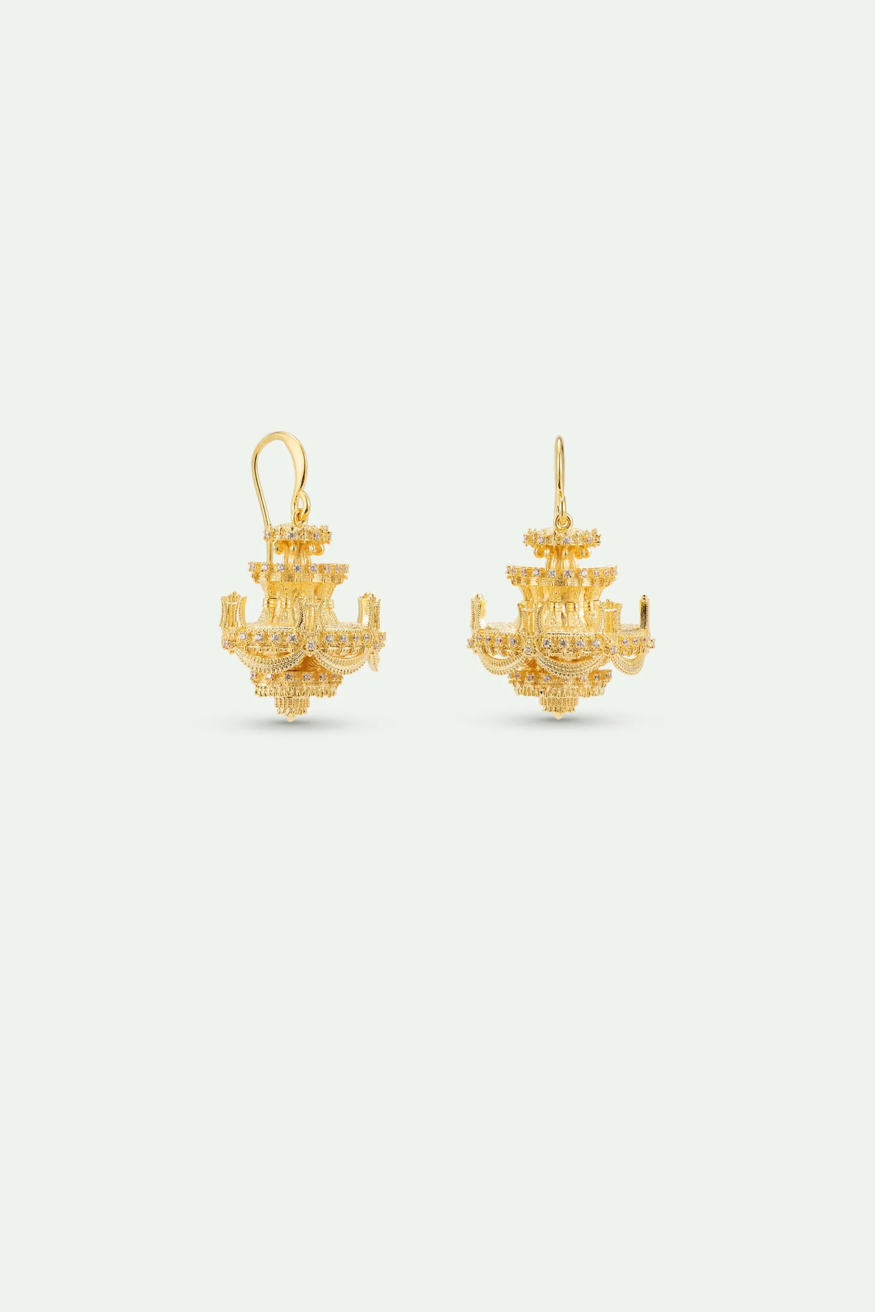 Boucles d’oreilles crochets pendantes, chandelier en laiton doré à l’or fin orné d’oxydes de zirconium.