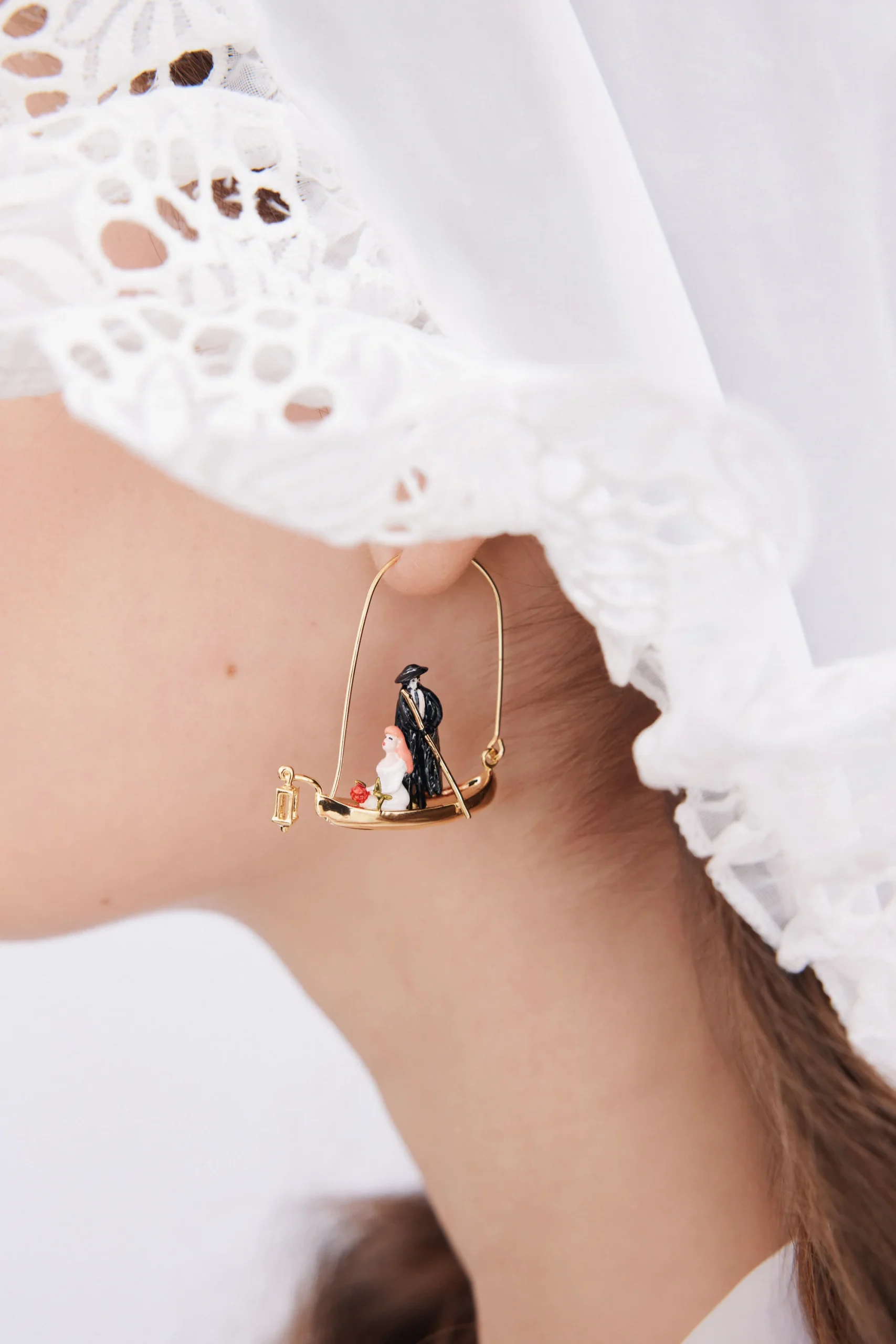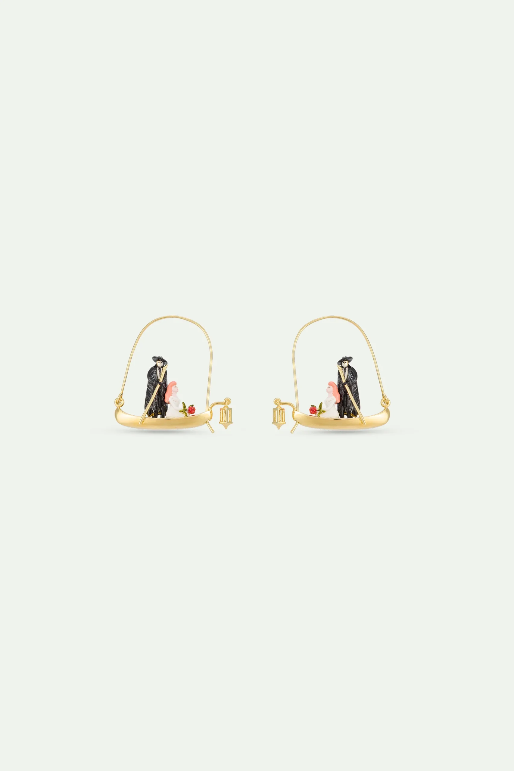 Boucles d’oreilles crochets en forme de bateau en laiton doré à l’or fin, personnages peints à la main, scène poétique du Fantôme de l’Opéra où le héros emporte sur une barque la cantatrice dont il est amoureux.