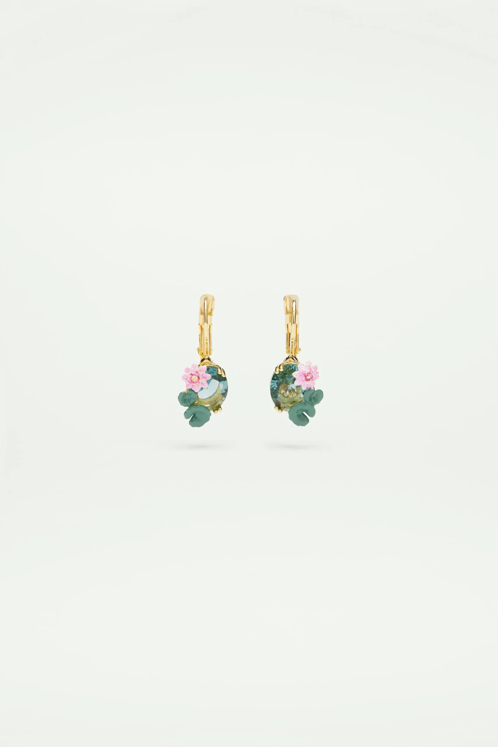 Boucles d’oreilles dormeuses pierre ovale verte aux nuances de bleu en verre taillé, ornée d’une fleur de lotus et de nénuphars en résine laquée peinte à la main. Continuons la visite du musée d’Orsay avec le Bassin aux Nymphéas, harmonie rose de Claude Monet. Cette parure rappelle les fleurs flottant à la surface du bassin vert d’eau du tableau impressionniste, ravivant l’émotion ressentie à Giverny, dans le jardin du peintre. Collaboration Les Néréides x Musée d’Orsay