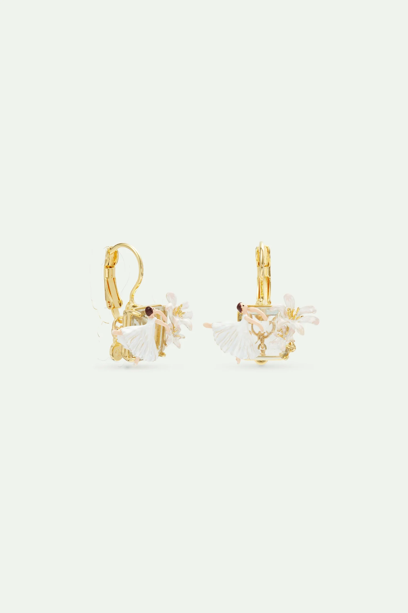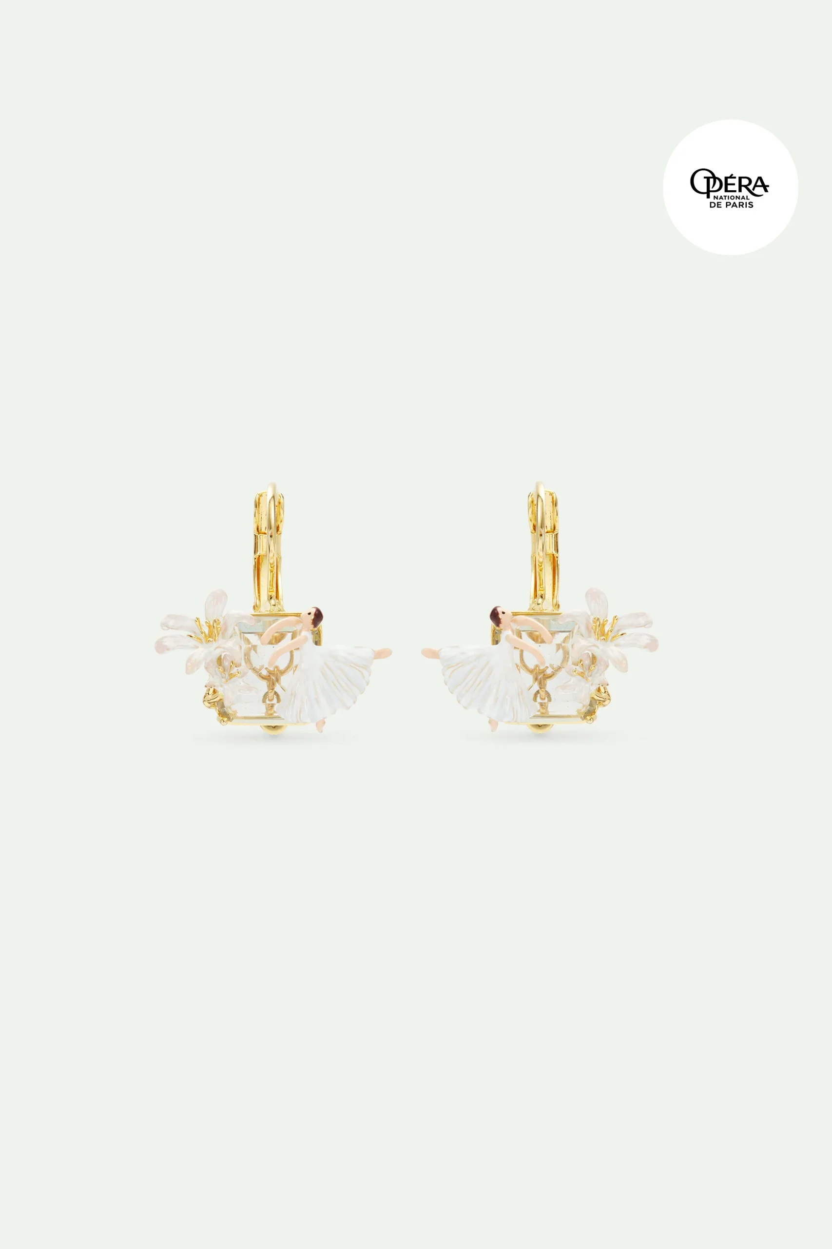Boucles d’oreilles dormeuses pierre en verre facetté taille émeraude, ballerine en tutu blanc accompagnée d’une fleur de lys blanche peinte à la main. Pour célébrer les 150 ans du Palais Garnier, la Maison les Néréides a conçu des parures imprégnées de l’esprit de l’Opéra. Cette collection vous mène à la rencontre du plus romantique des ballets, ici mis à l’honneur : Giselle.