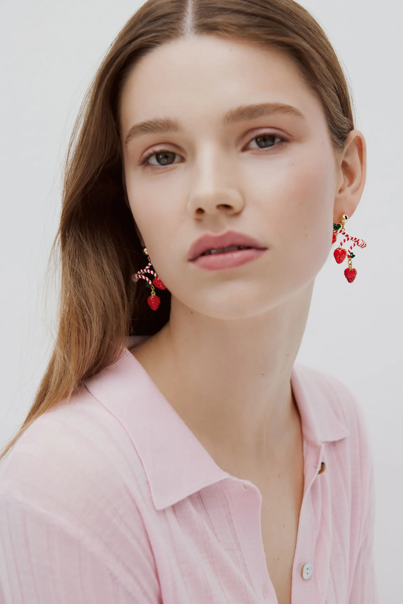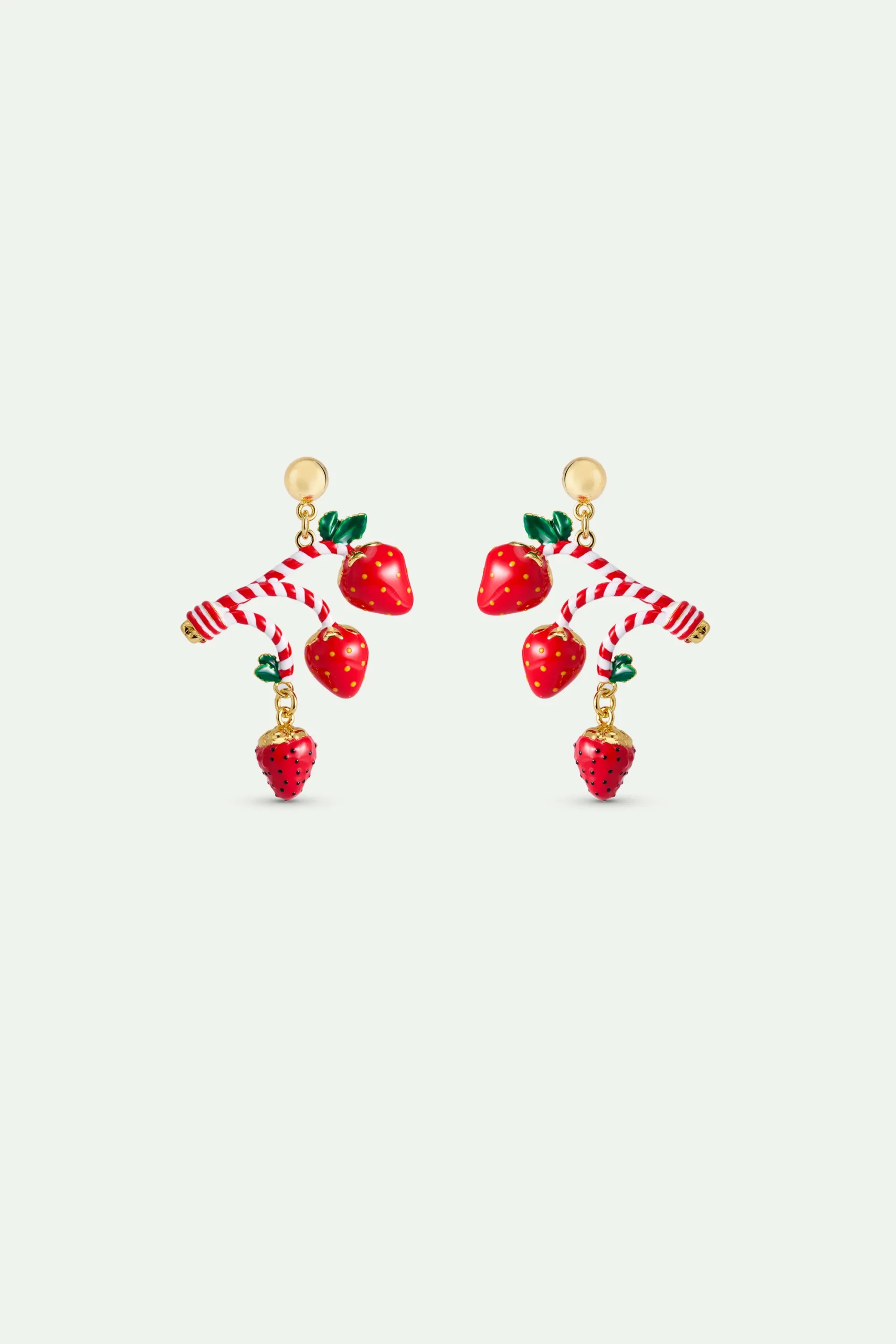 Boucles d’oreilles pendantes fraise et sucre d’orge délicatement . La collection Miam Miam Candy célèbre les douceurs enfantines avec des parures gourmandes et colorées.