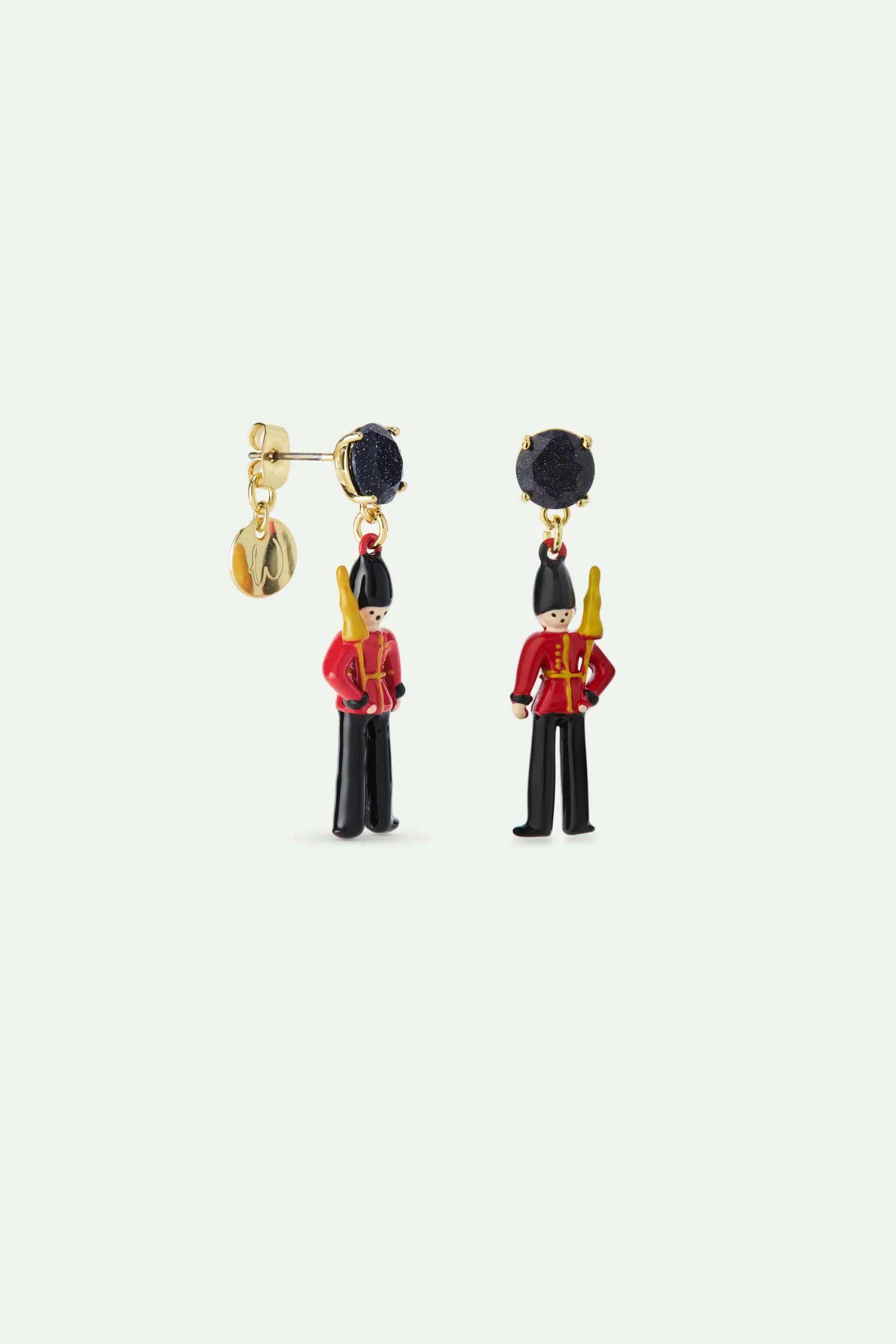 Boucles d’oreilles en laiton doré à l’or fin, garde royal noir et rouge et verre facetté noir. Cette collaboration avec Willemien Bardawil, artiste anglaise à l’univers joyeux et coloré, vous emmène fêter Noël à Londres.