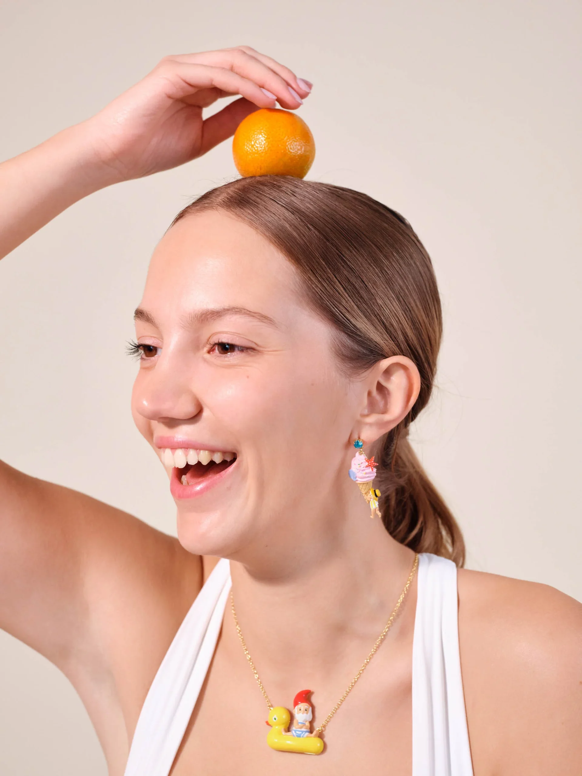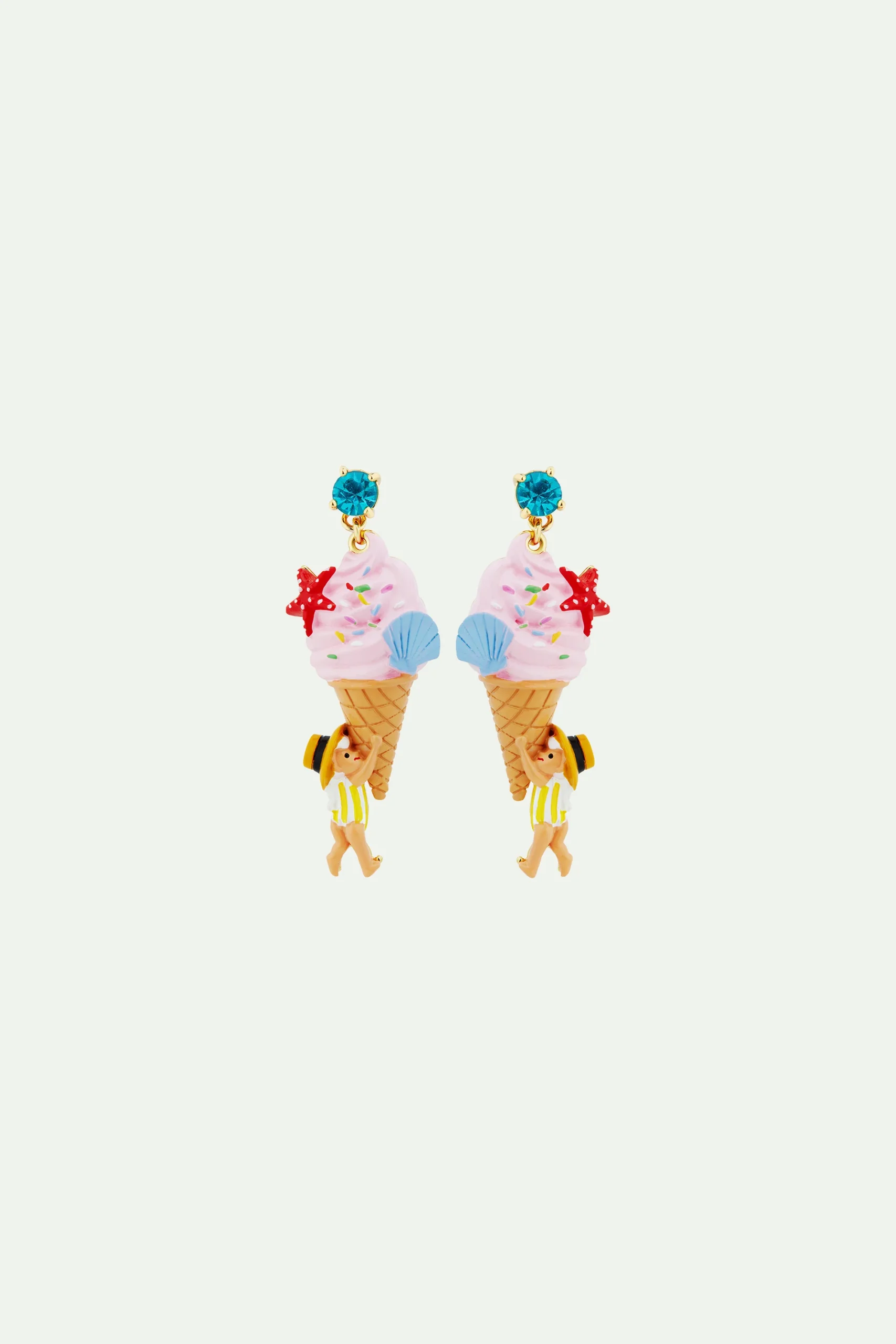 Boucles d’oreilles nain de jardin suspendu à une glace à l’italienne, coquillage et étoile de mer , ornées d’un cristal bleu. Sur le rivage ensoleillé, la famille de nains de jardin s’aventure avec émerveillement sur la plage. Cette parure est assortie aux collections Splendeurs des Profondeurs et Charm’s.