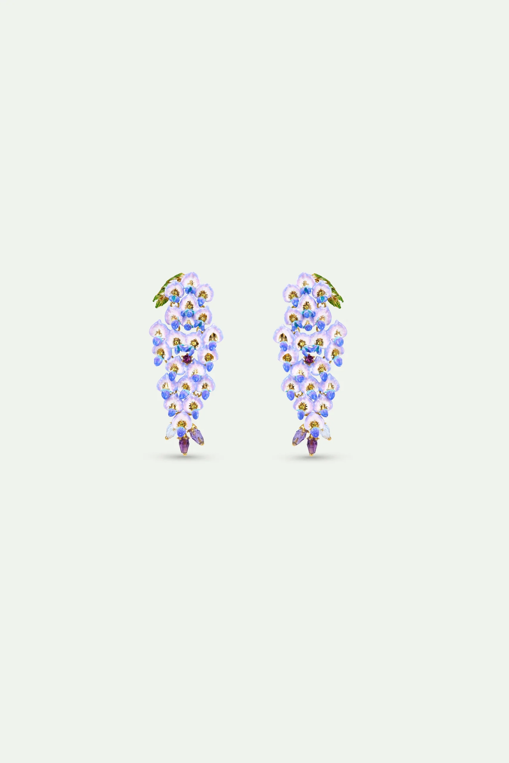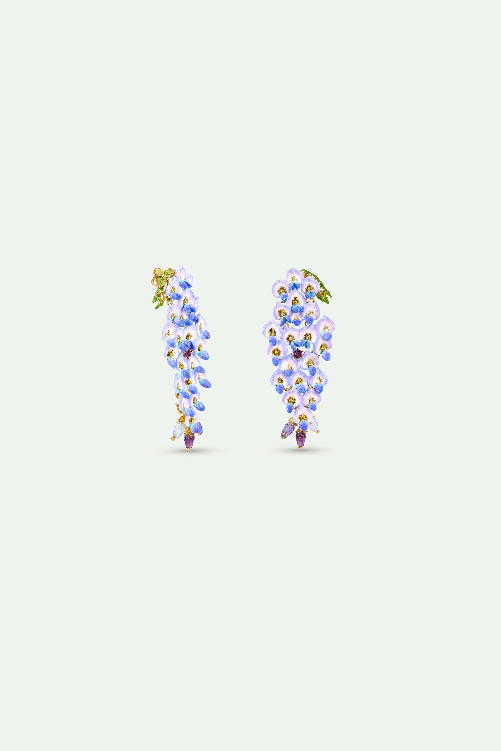 Boucles d’oreilles cascade de petites fleurs de glycines bleues pendantes peintes à la main, ornées de cristaux facettés. Plusieurs heures de travail sont nécessaires pour appliquer minutieusement la couleur au pinceau et obtenir un dégradé de violet.