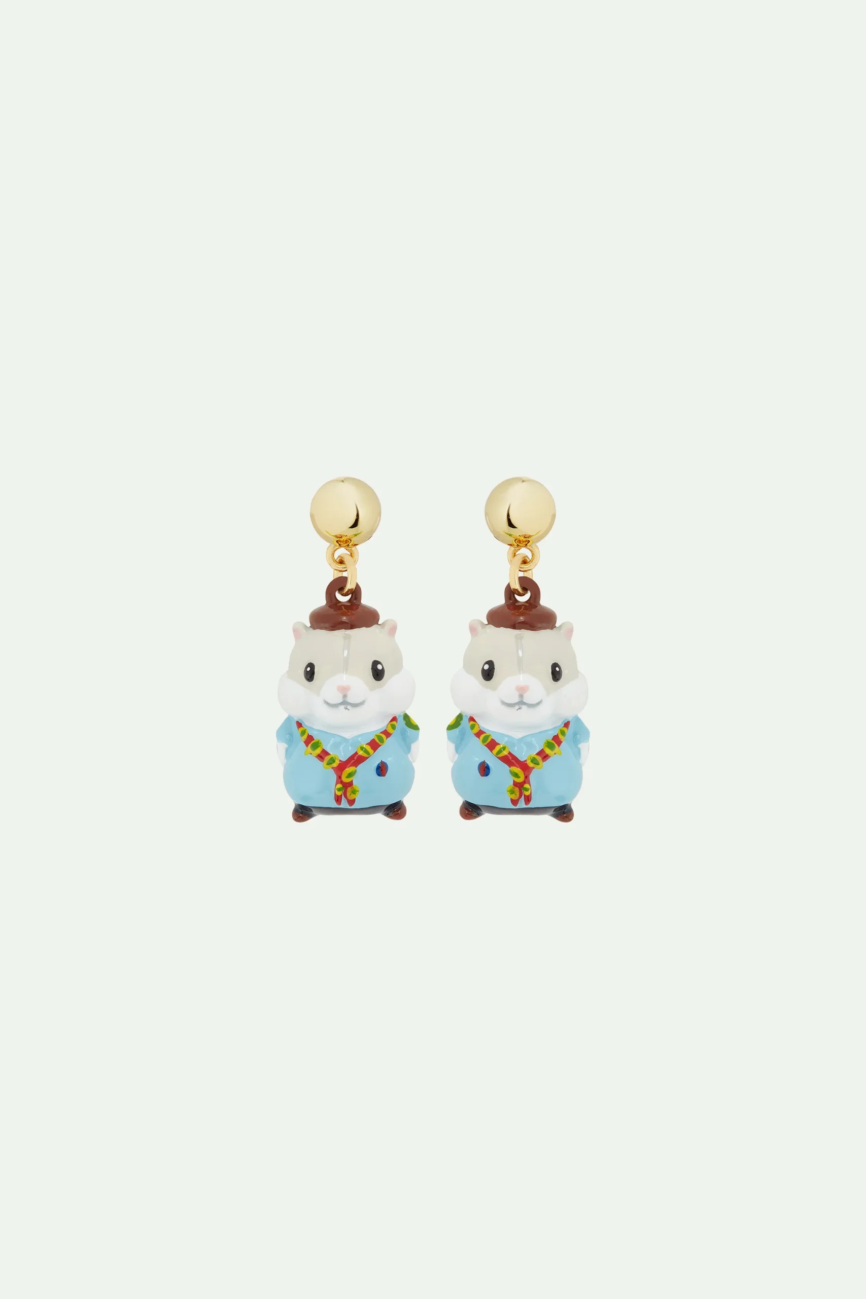 Boucles d’oreilles hamster scout peint à la main, perles dorées à l’or fin. De charmants compagnons partis à la recherche de graines de tournesol.