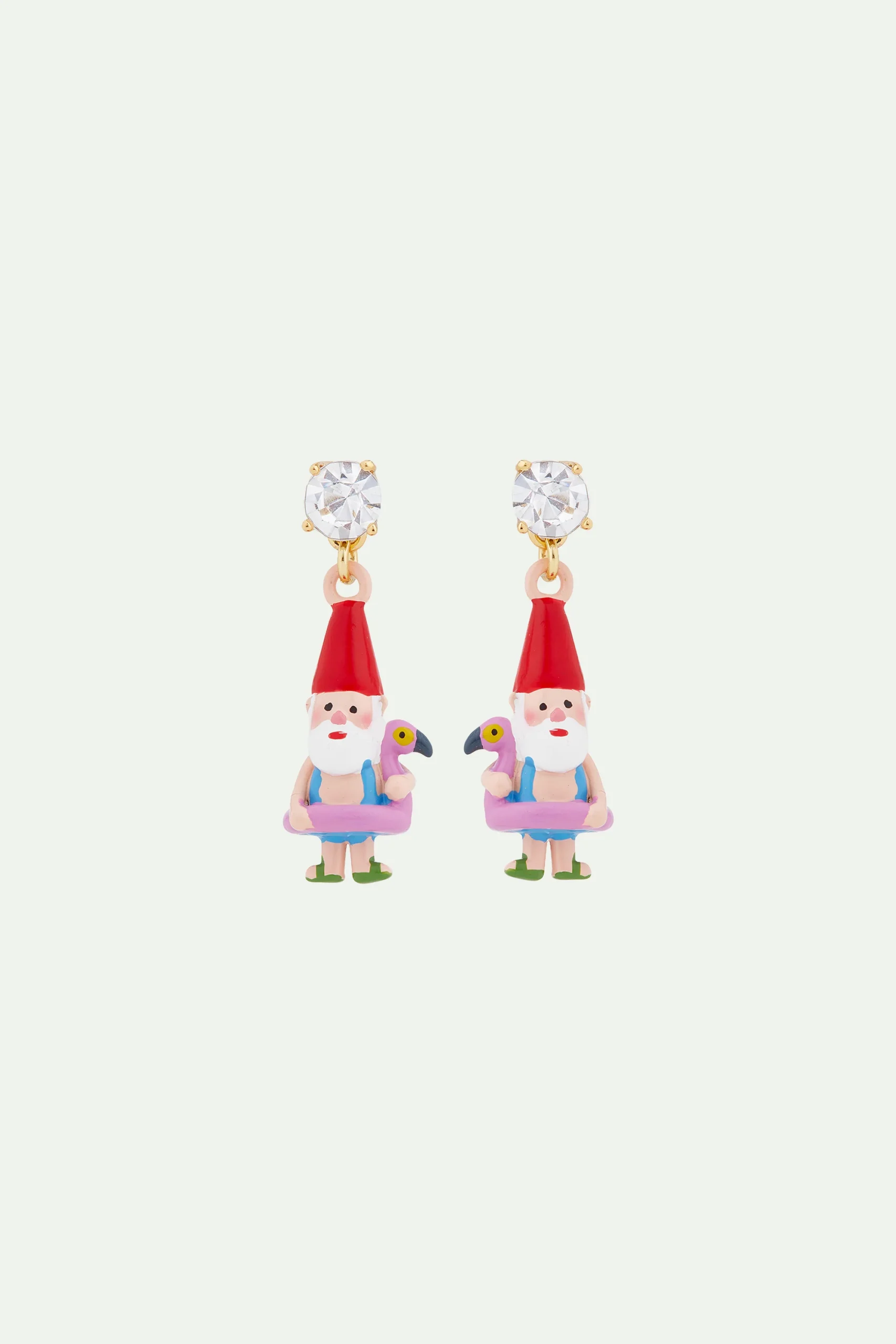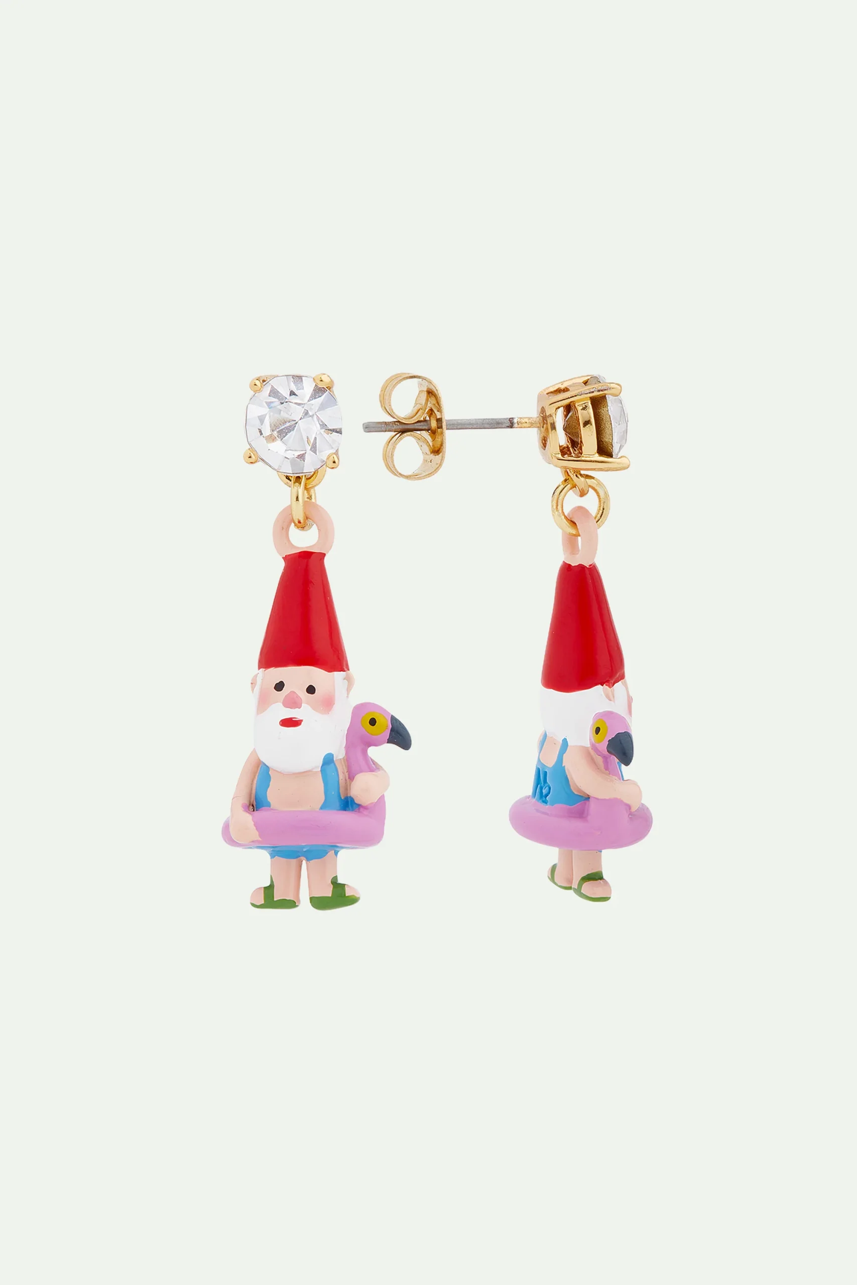 De part et d’autre de ces boucles d’oreilles haute fantaisie, deux adorables nains de jardin vêtus d’un maillot de bain et d’une bouée flamant rose s’apprêtent à profiter d’un moment de loisir à la piscine ou à la mer. Décorez vos oreilles de ces petits personnages aussi attachants que drôles pour égayer votre tenue du jour. Boucles d’Oreilles Clip : laiton doré à l’or fin, , cristal facetté et résine.