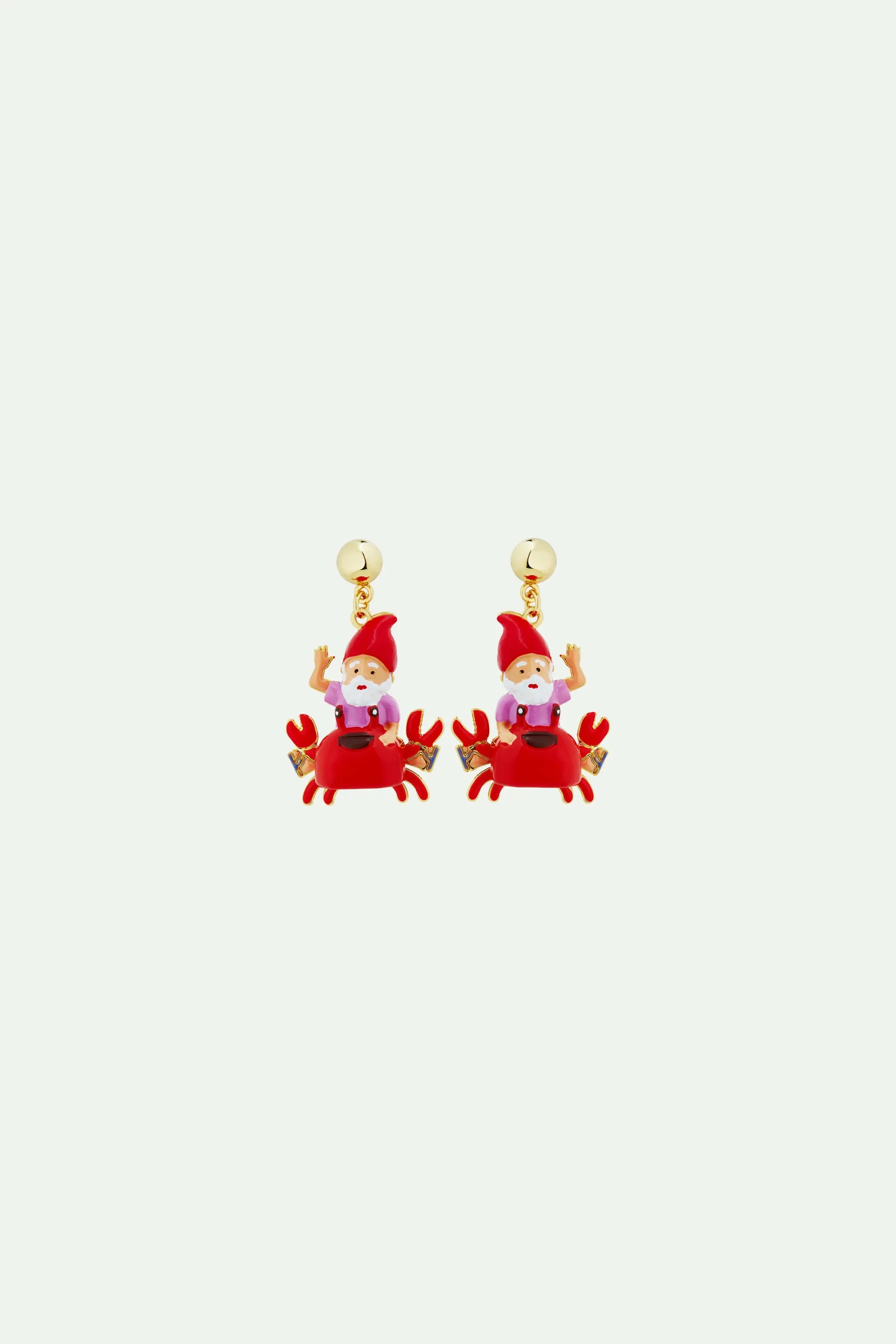 Boucles d’oreilles nain de jardin sur le dos de son ami le crabe, personnages , perles dorées à l’or fin. Sur le rivage ensoleillé, la famille de nains de jardin s’aventure avec émerveillement sur la plage. Cette parure est assortie aux collections Splendeurs des Profondeurs et Charm’s.