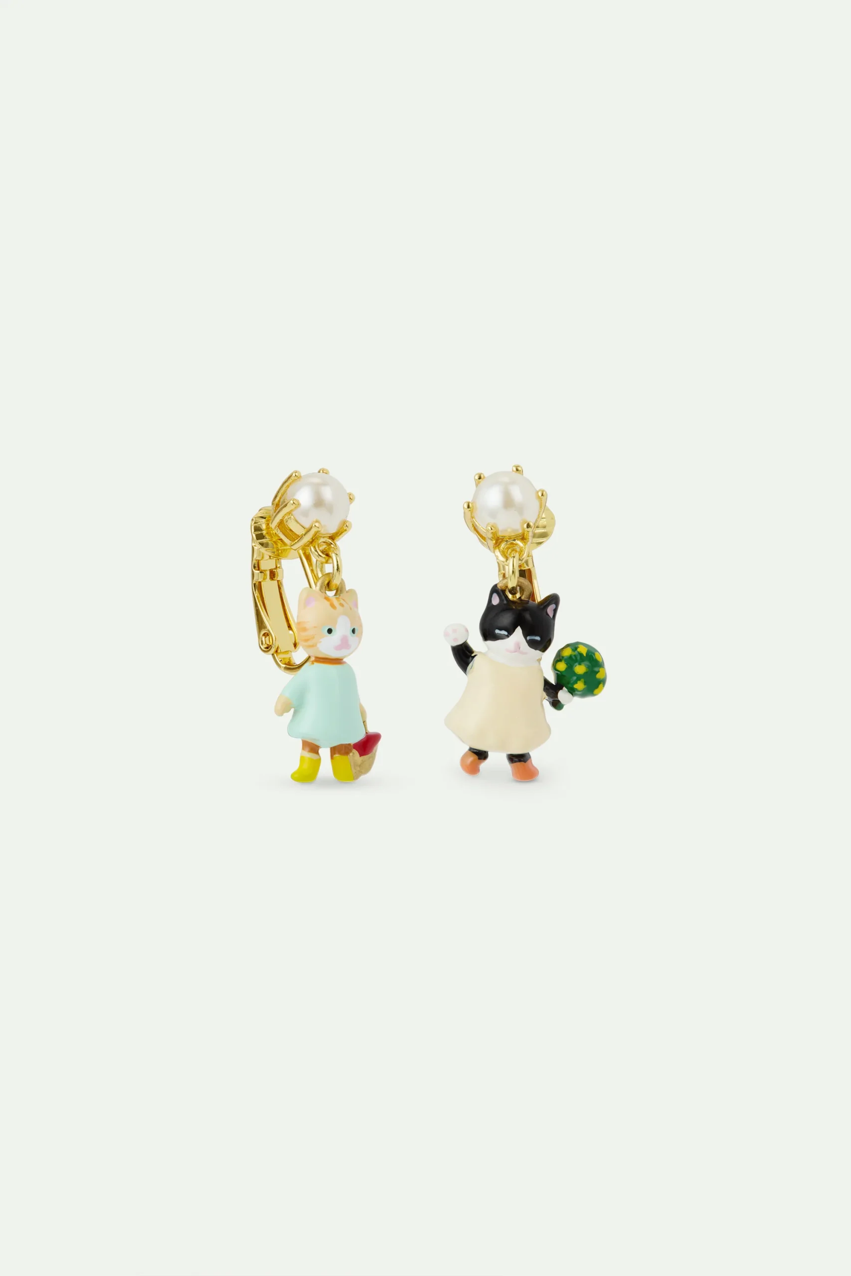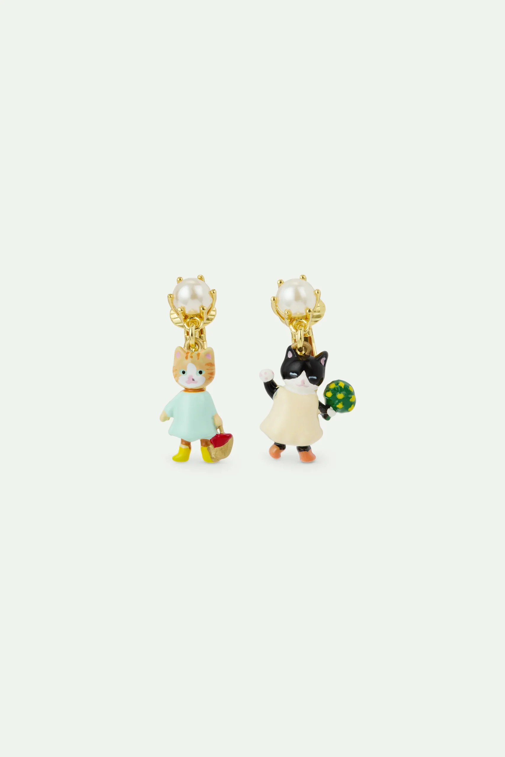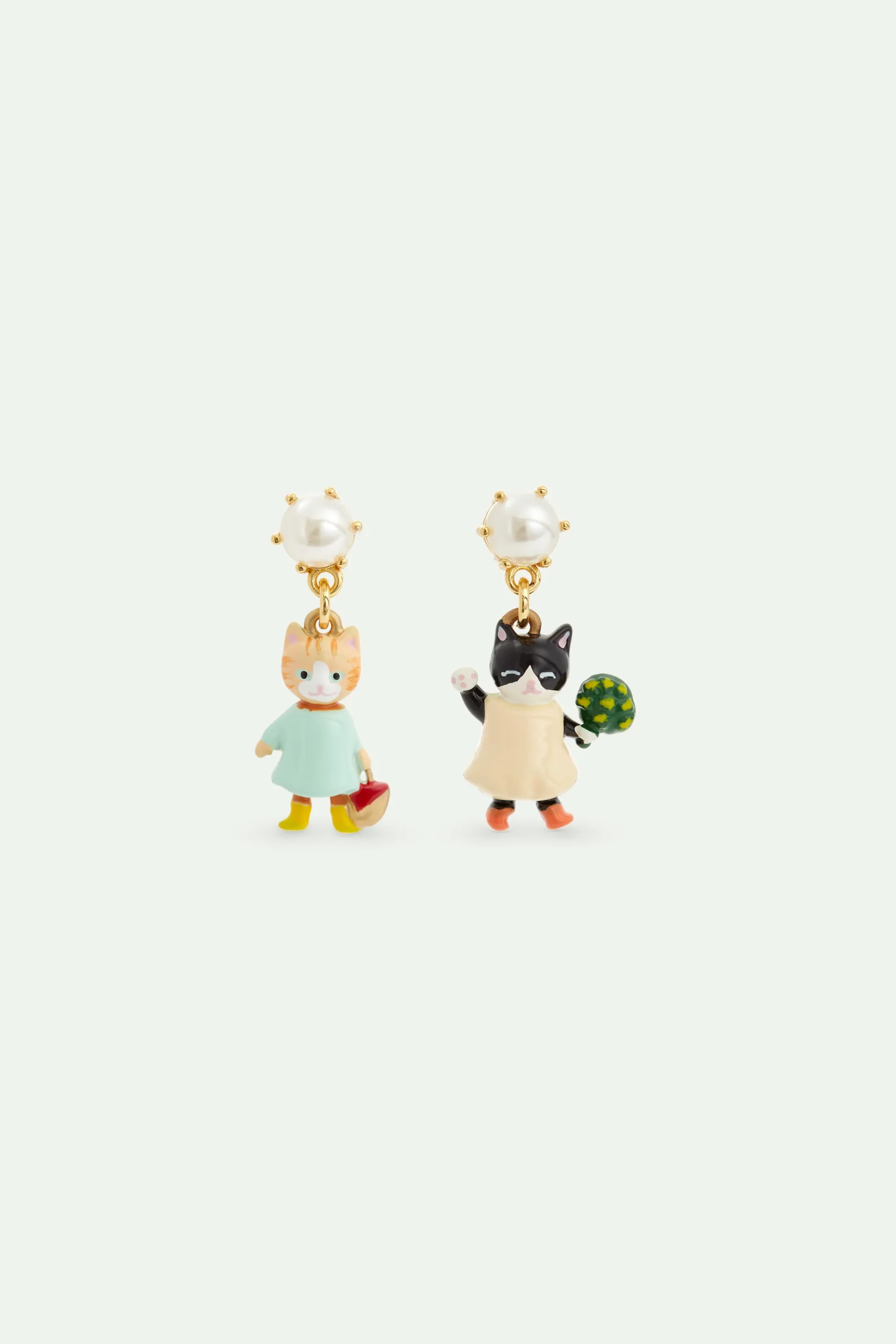 Boucles d’oreilles pendantes asymétriques chaton roux et noir en tenue de pique-nique, ornées d’une perle fantaisie blanche. La collection Happy Picnic suit une famille de chats dans une journée ensoleillée dans Paris, accompagnés de leur ami le chien.