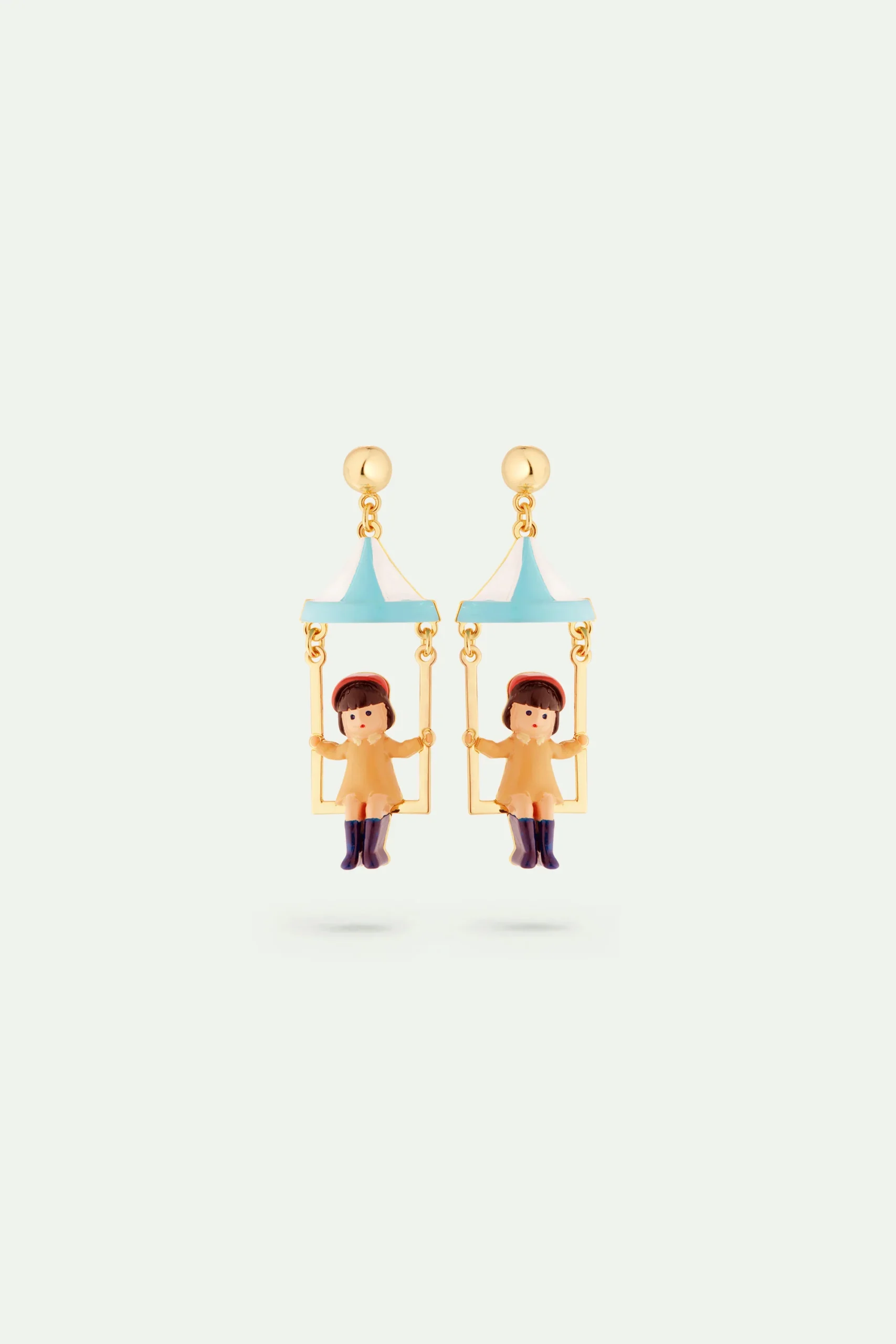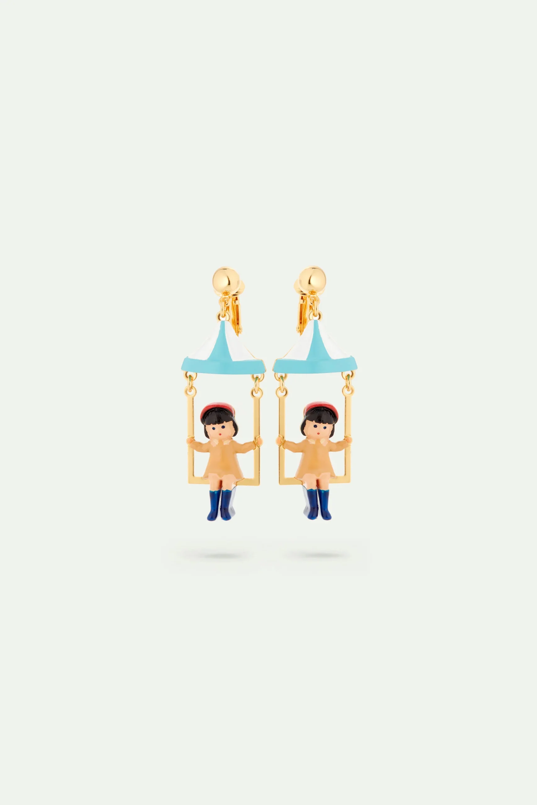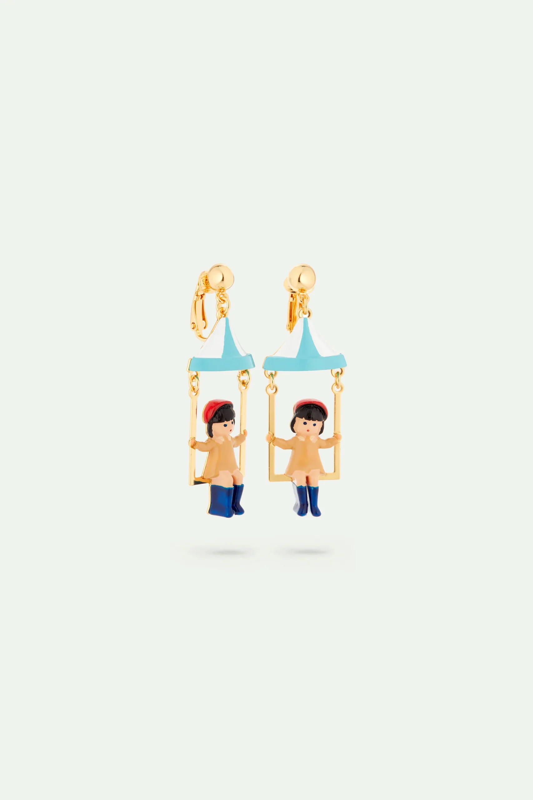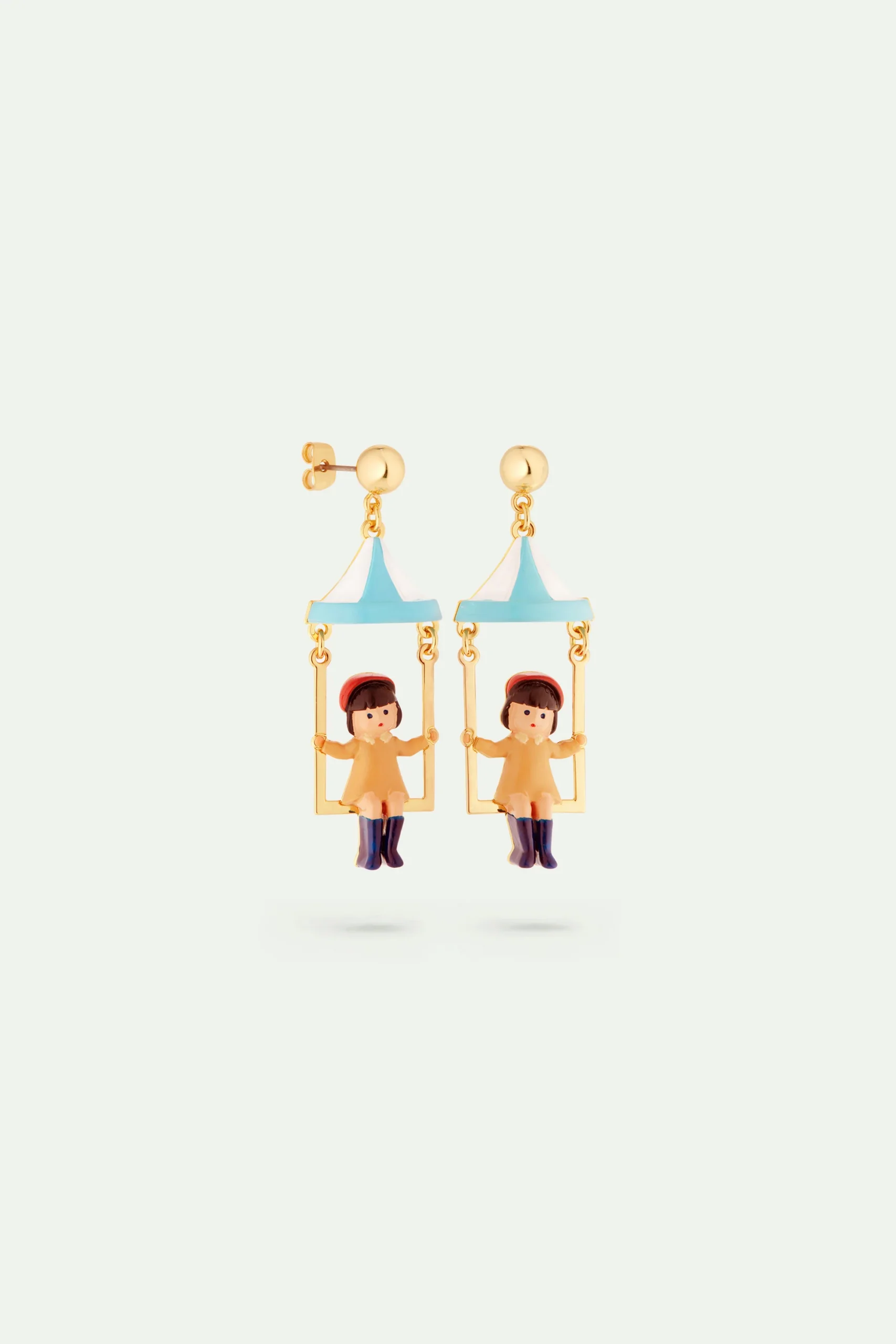Boucles d’oreilles présentant une petite fille habillée d’un béret rouge et d’une robe jaune sur un manège. Lors de ce qu’on pourrait imaginer être un après-midi d’automne au jardin des Tuileries, une petite fille, appelons-la Madeleine, se promène avec son teckel, appelons-le Octave. D’attraction en attraction, les bijoux en résine peinte à la main nous emmènent dans le monde merveilleux des manèges, pommes d’amour, barbes à papa, et autres petits canards.
