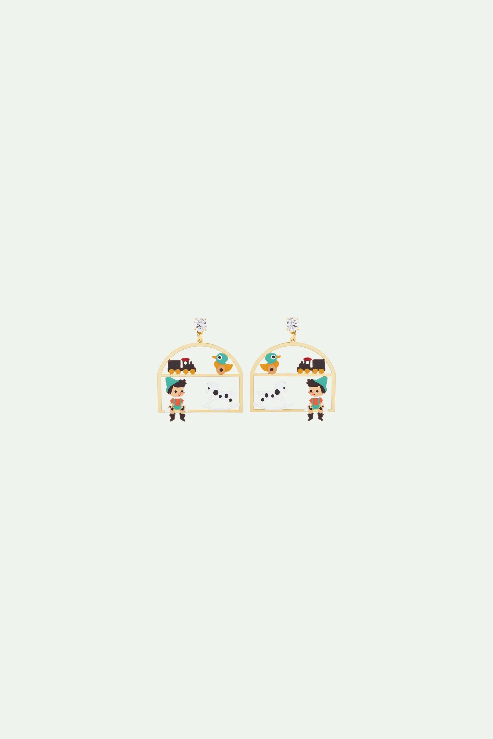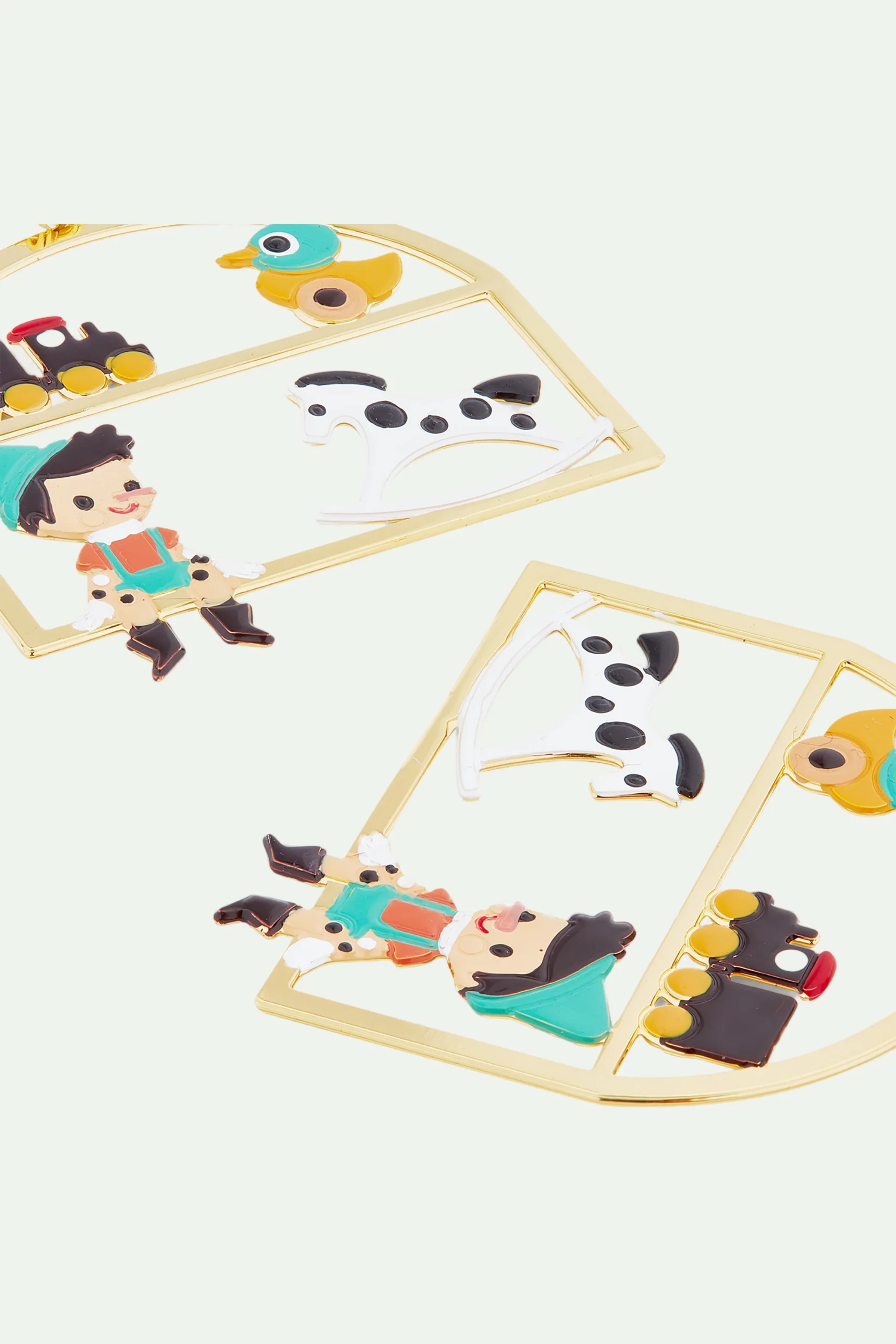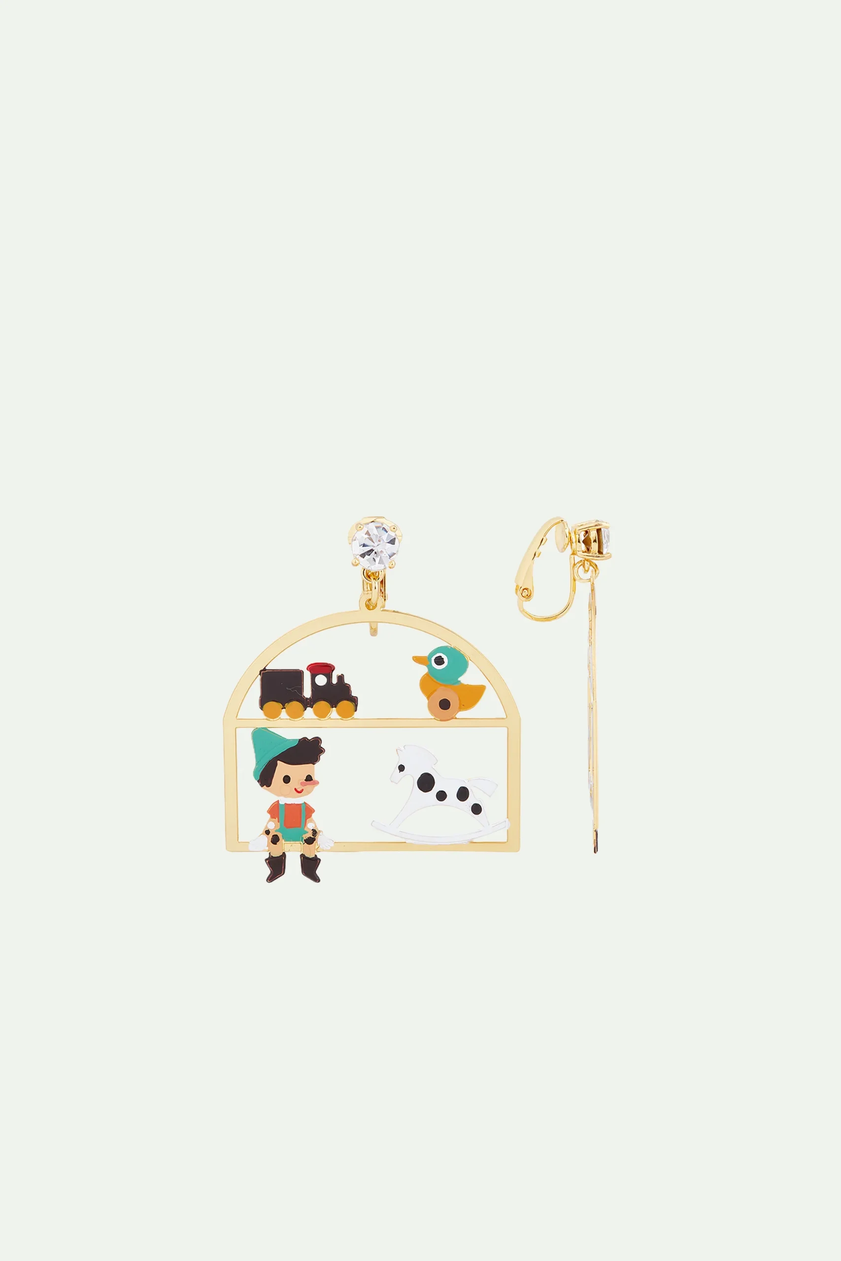 Cette paire de boucles d’oreilles procure un sentiment de nostalgie. Elle présente deux étagères superposées sur lesquelles reposent des jouets d’enfants: un canard, un train, un cheval à bascule et le célèbre pantin de bois au nez qui s’allonge.