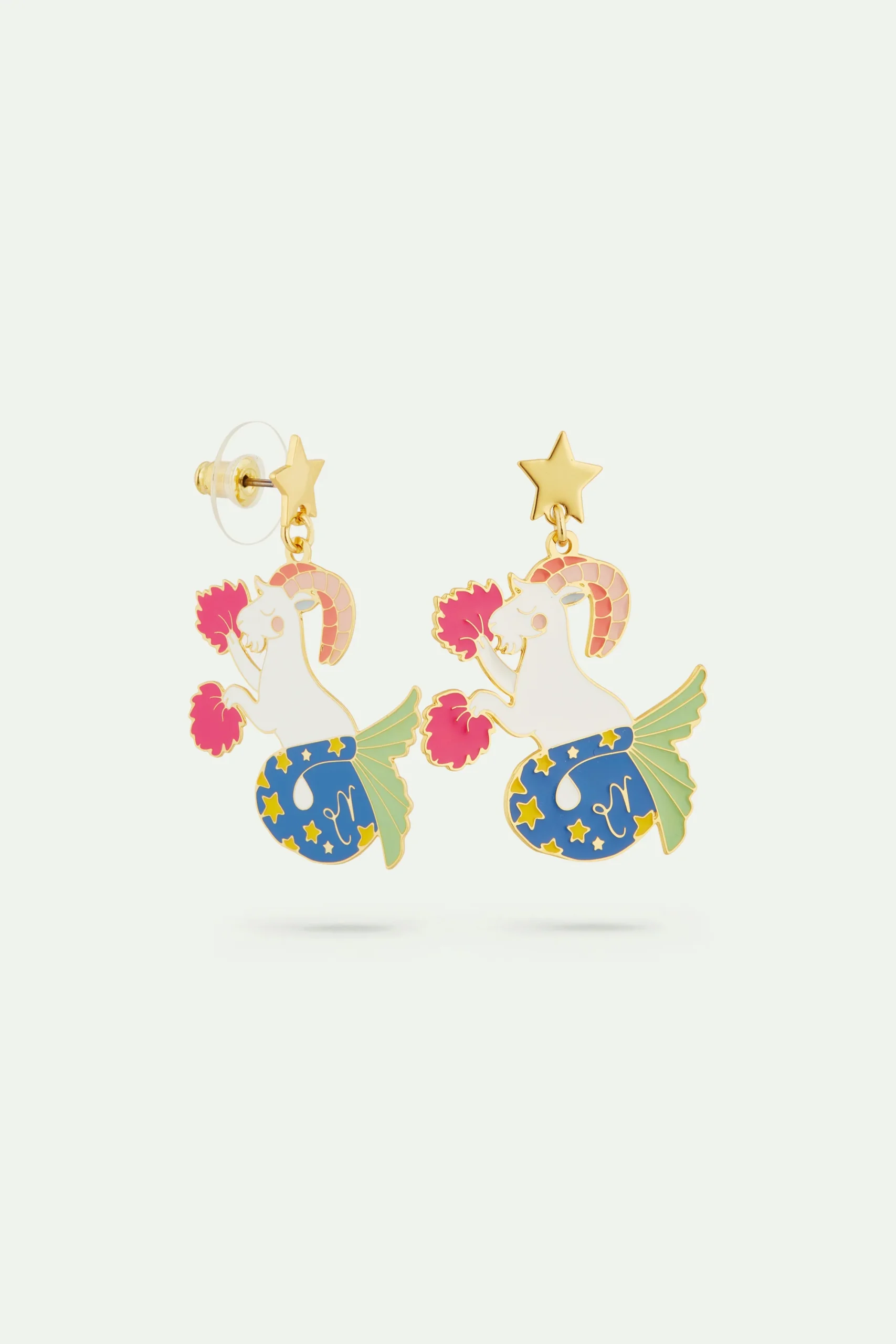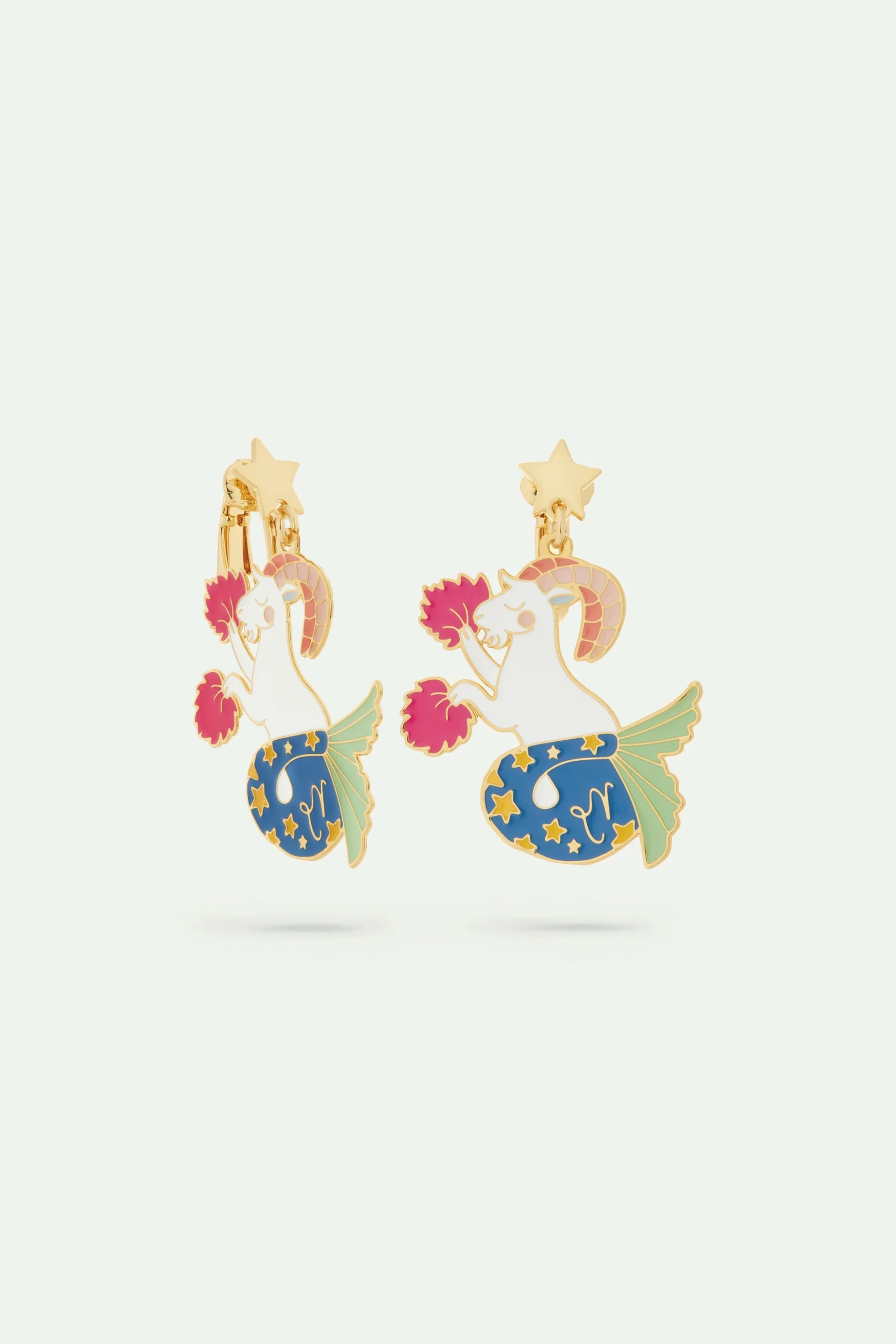 Sur ces boucles d’oreilles est représenté le signe astrologique du capricorne sous forme d’un animal mi-bouc, mi-poisson. La partie bouc est blanche avec des cornes roses et la partie poisson, où l’on trouve le signe astrologique du capricorne, est bleue. La thématique Astrologie, chère au cœur des Néréides, est traitée pour la première fois chez N2. Animaux et personnages aux couleurs acidulées se prêtent, à leur manière, au jeu des étoiles et du destin !