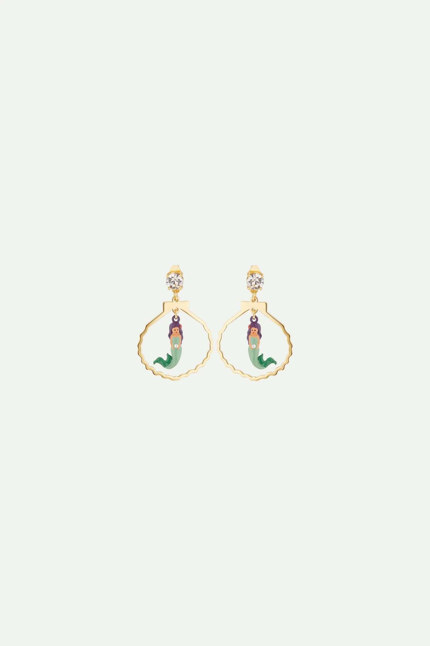 Boucles d’oreilles sirène peinte à la main suspendue dans un coquillage en laiton doré à l’or fin et tenant une petite perle fantaisie nacrée, pierre ronde sertie en verre taillé. La Maison Les Néréides réinvente le conte de La Petite Sirène et ses nombreux amis les dauphins, hippocampes et autres étoiles de mer.